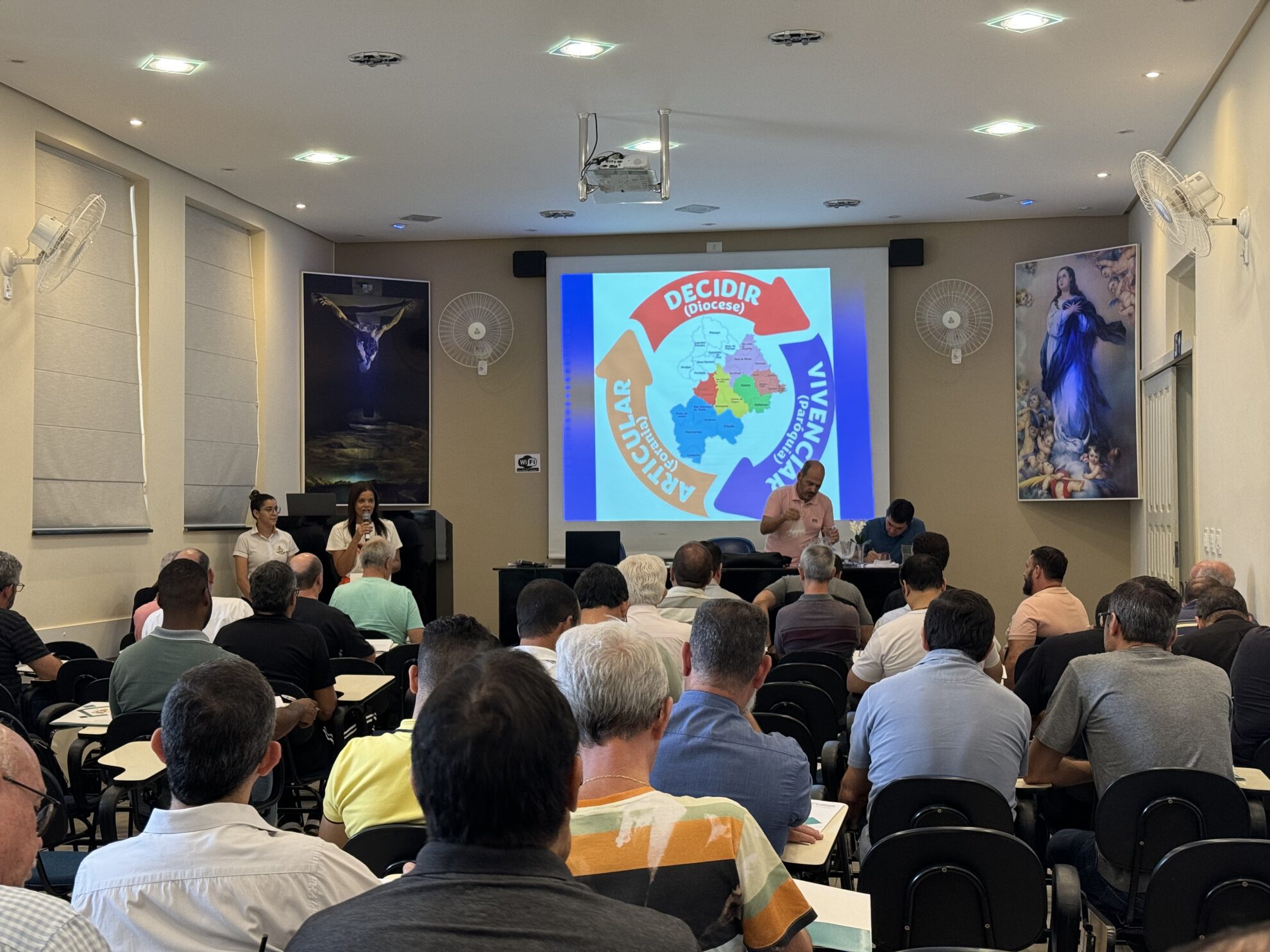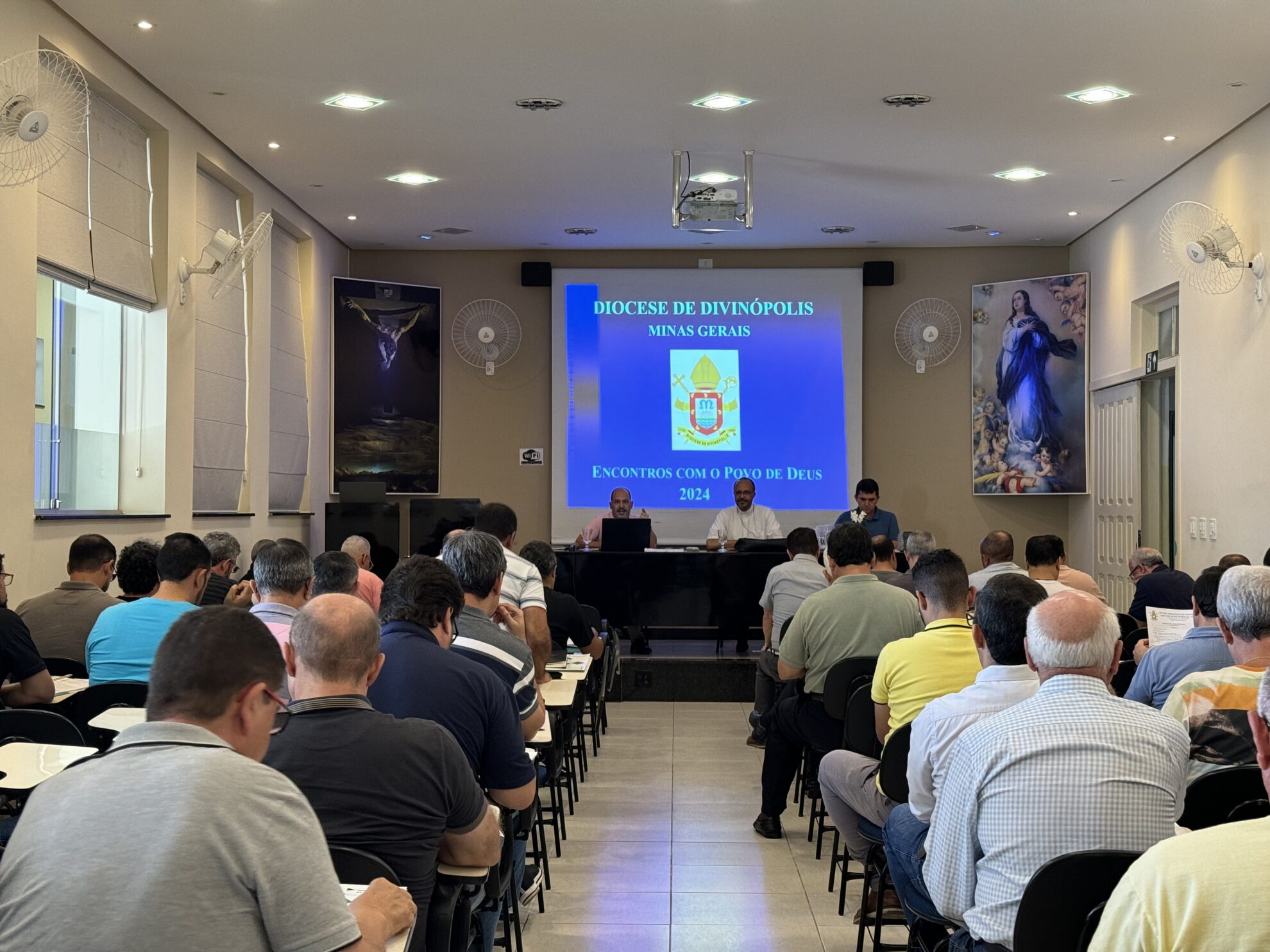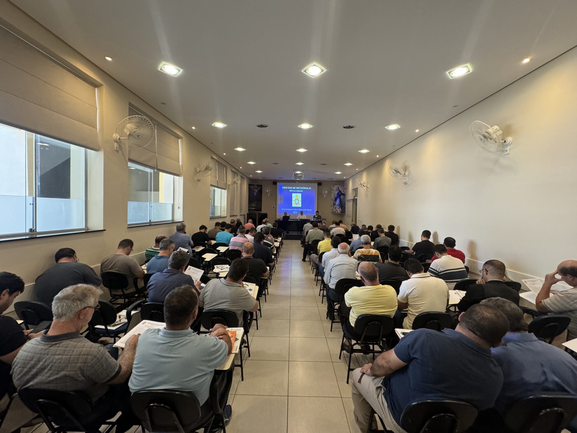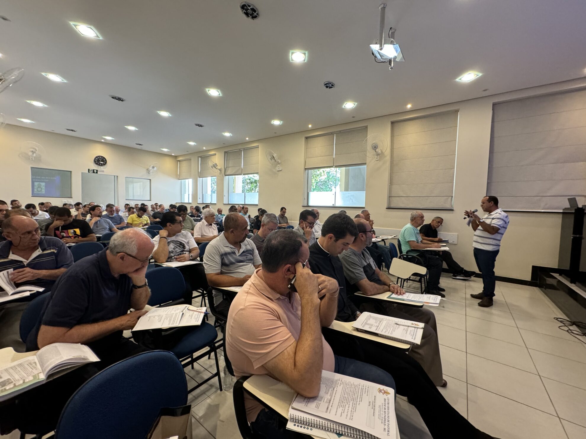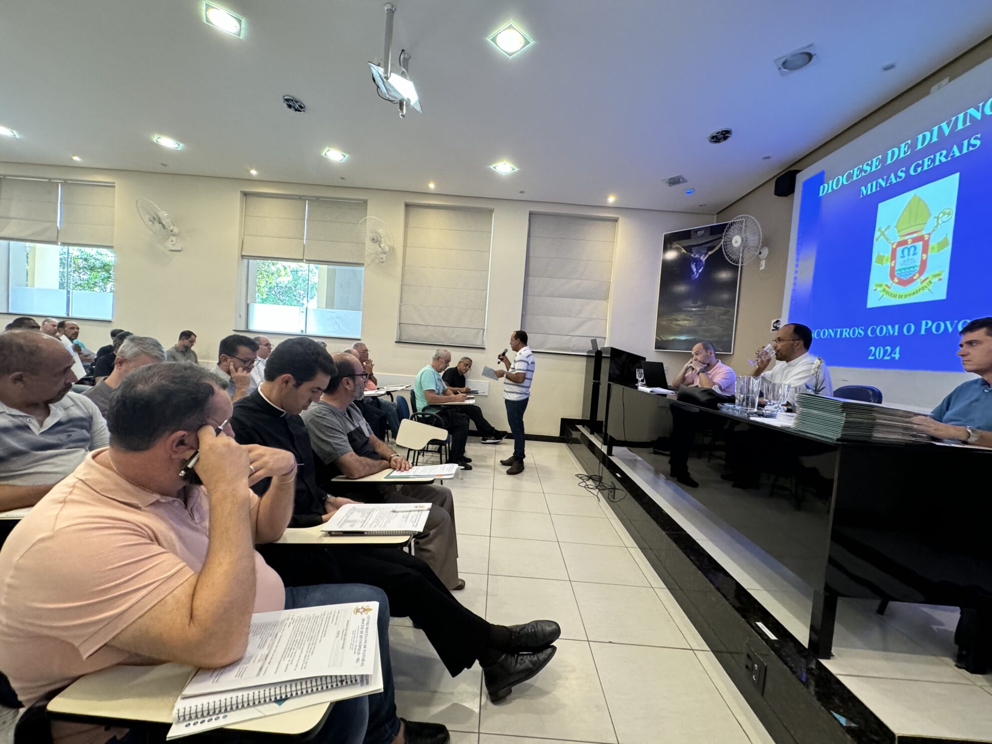 Nesta terça-feira (27/02), se reuniram na Cúria Diocesana, o bispo, os presbíteros e diáconos transitórios para a tradicional Reunião do Clero. Após a oração inicial na Capela da Cúria, os clérigos se digiriam ao auditório Imaculada Conceição para o inicio das tratativas. A pauta da reunião contou com exposição do trabalho realizado pela Pastoral Carcerária, com presença de Pe. Anderson Fonseca, assessor eclesiástico em nível diocesano e Irmã Nieves e Diácono Oscar, da Arquidiocese de Belo Horizonte.