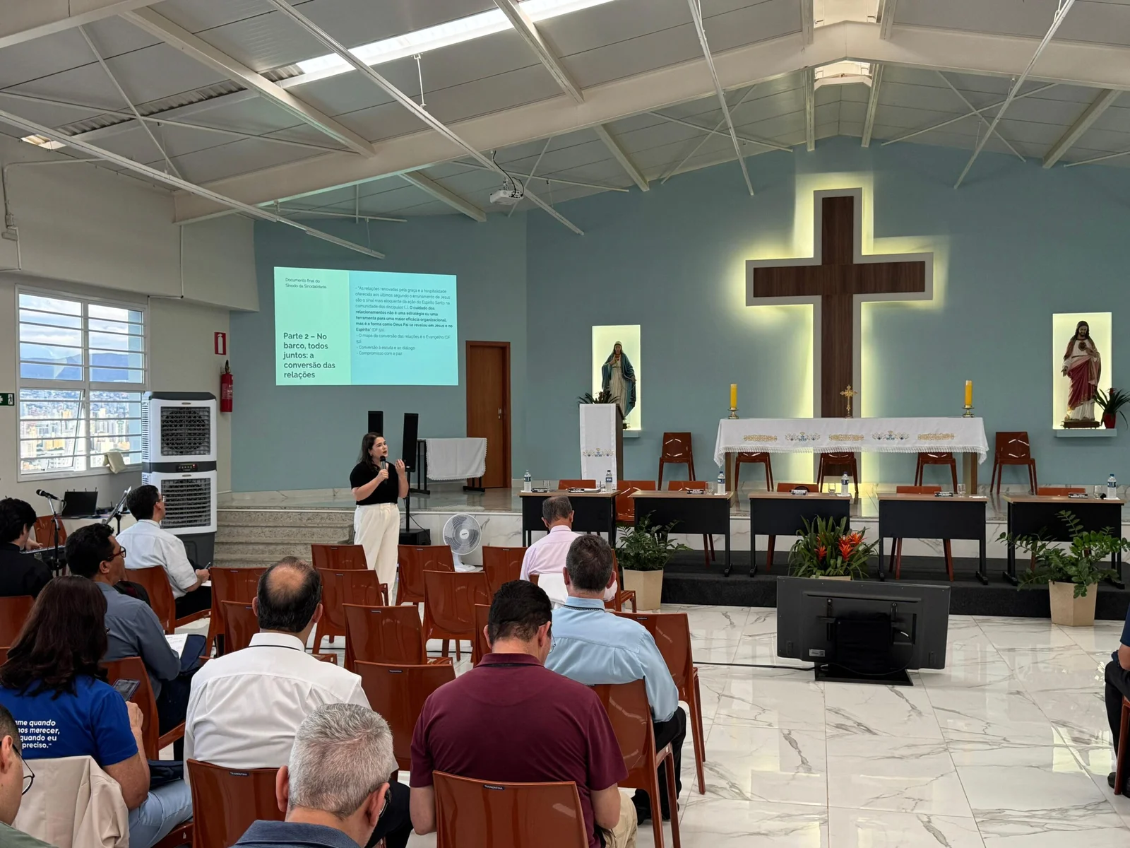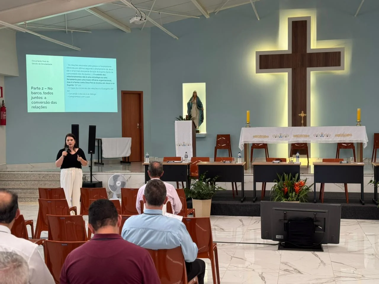 Mariana explicou que a sinodalidade, mais do que uma metodologia, é um modo de ser Igreja. Trata-se de um processo contínuo de escuta e discernimento, no qual todos os batizados são chamados a participar e a assumir com responsabilidade a missão evangelizadora. Essa conversão pastoral exige mudanças nas formas de decisão e na cultura comunitária, superando posturas individualistas e fortalecendo os conselhos e espaços de diálogo como verdadeiros lugares de comunhão. Mais do que existirem formalmente, esses organismos precisam expressar um estilo de Igreja que caminha junto e aprende a construir consensos na escuta do Espírito. Durante a reflexão, foi ressaltado a importância de compreender o dízimo como expressão da corresponsabilidade dos fiéis pela missão da Igreja, e não apenas como contribuição financeira. Quando os membros da comunidade reconhecem que o dízimo sustenta não só o templo, mas também toda a ação evangelizadora e caritativa, o gesto se torna sinal de fé e de comunhão. Nesse sentido, a transparência foi apontada como elemento essencial para fortalecer o senso de pertencimento e a confiança nas comunidades. Tornar claros os gastos e as ações pastorais, segundo ela, ajuda os fiéis a compreenderem que são parte ativa da missão e que a Igreja vai muito além do espaço celebrativo.