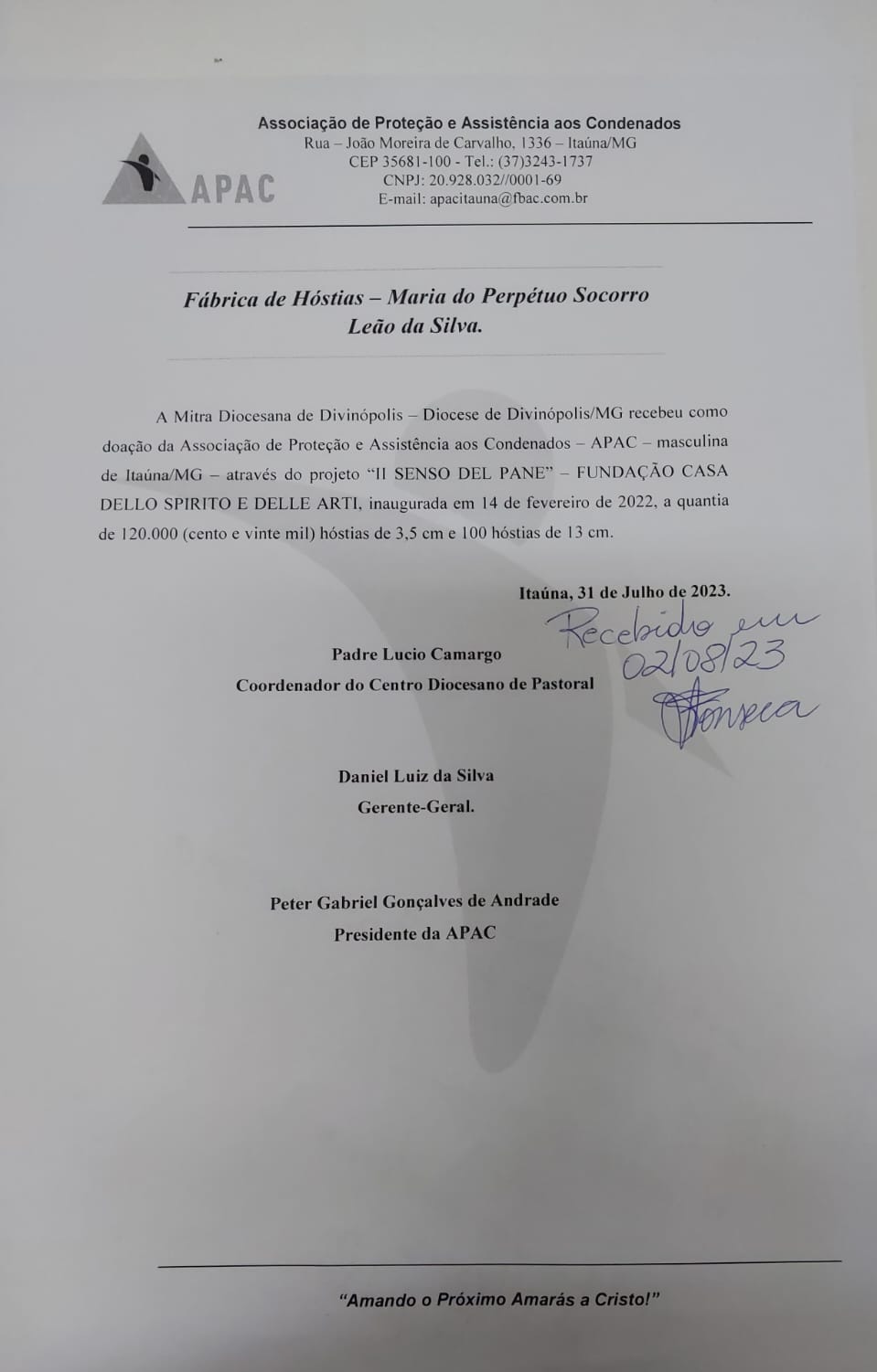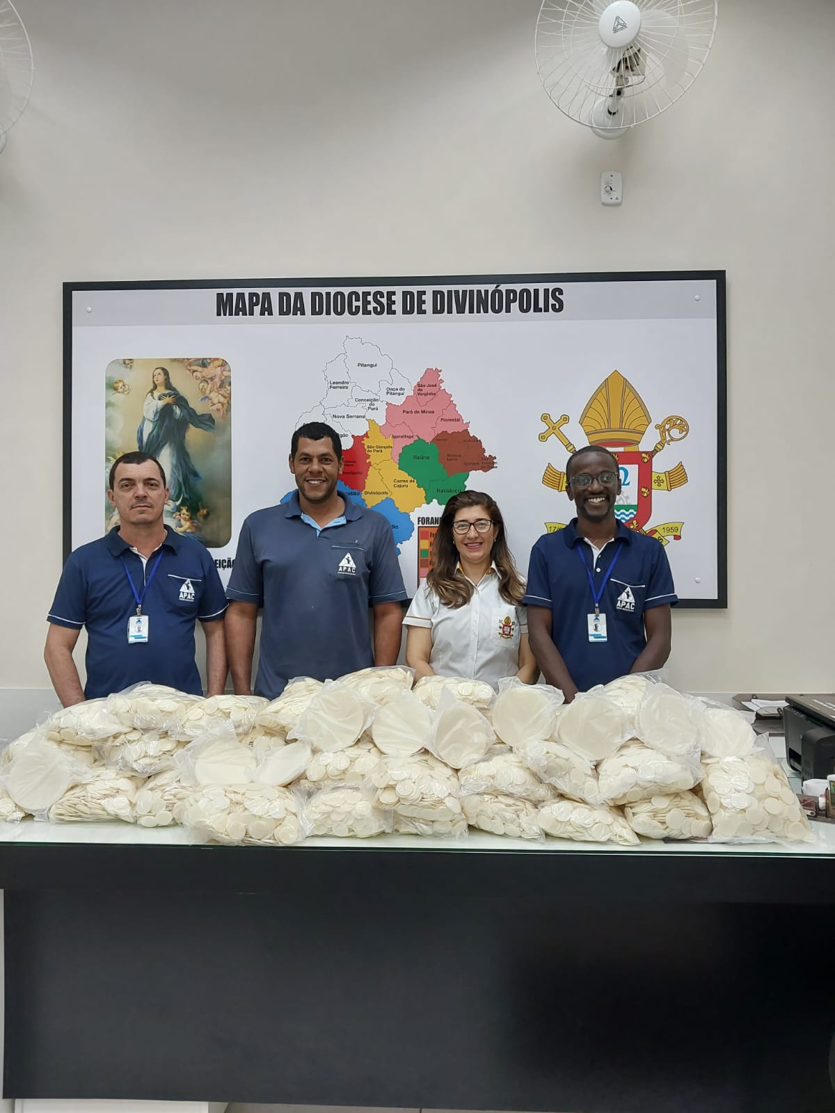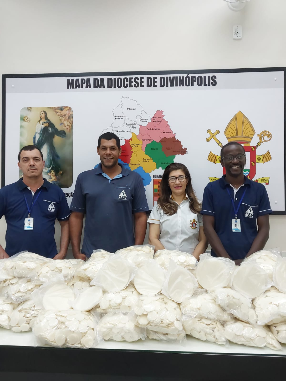 A Mitra Diocesana de Divinópolis recebeu nesta segunda-feira (31/07) uma doação da Associação de Proteção e Assistência aos Condenados – APAC – masculina de Itaúna/MG – através do projeto “II SENSO DEL PANE” – FUNDAÇÃO CASA DELLO SPIRITO E DELLE ARTI, inaugurada em 14 de fevereiro de 2022, a quantia de 120.000 (cento e vinte mil) hóstias de 3,5 em e 100 hóstias de 13 cm.