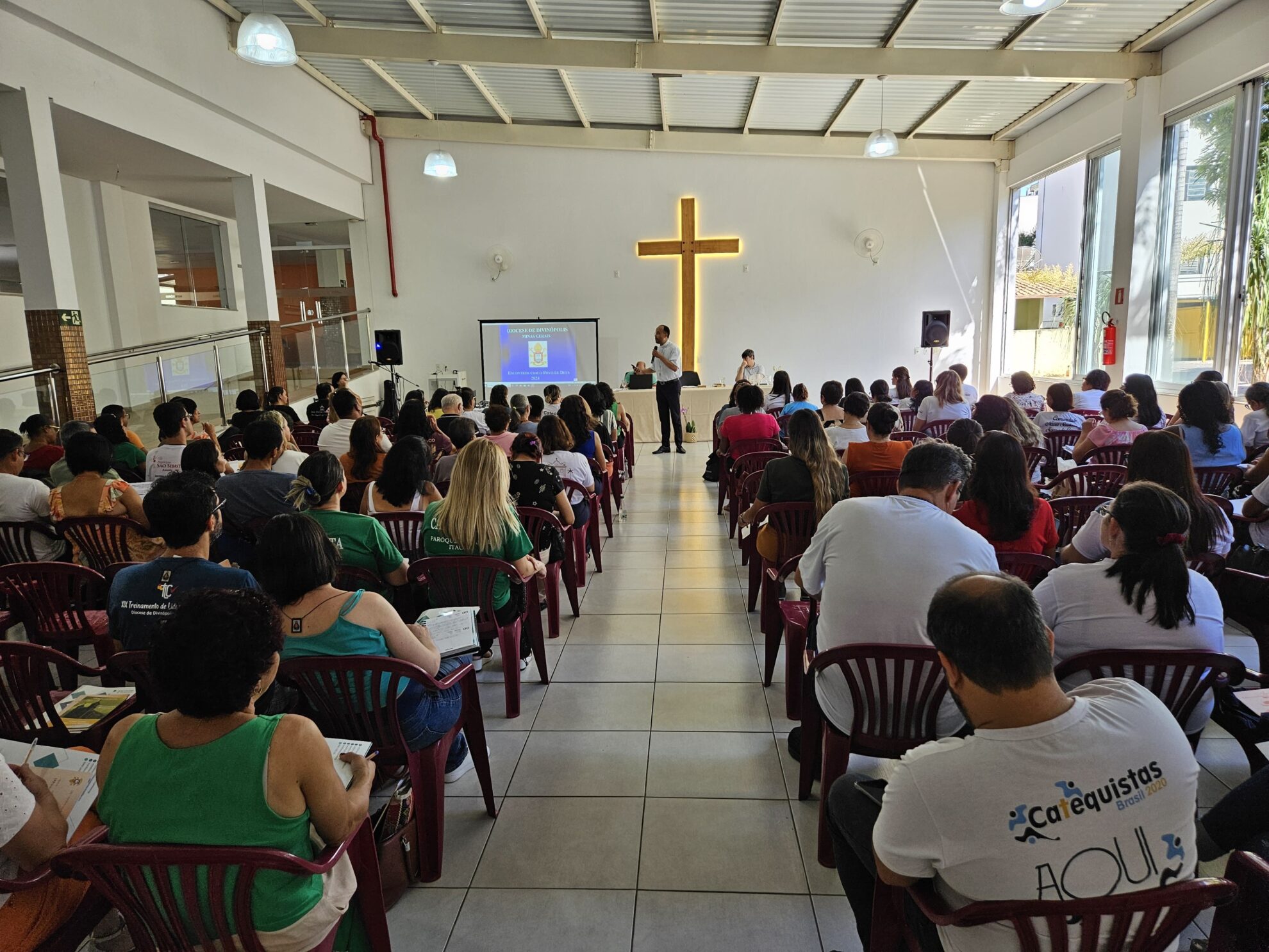 Em seguida, Dom Geovane Luís, bispo diocesano, falou aos catequistas sobre o sentido da Igreja como Povo de Deus a partir da Lumen Gentium. Ele apresentou que esse documento faz o convite para que sejamos abertos, servidores, discípulos-missionários. Como povo, como Igreja, convidou-nos a cuidar uns dos outros, pois somos todos irmãos. Disse ainda que é preciso estar aberto ao diferente, incentivando o diálogo e a escuta e, assim, com o serviço, buscar a comunidade e a unidade da nossa Igreja Particular.