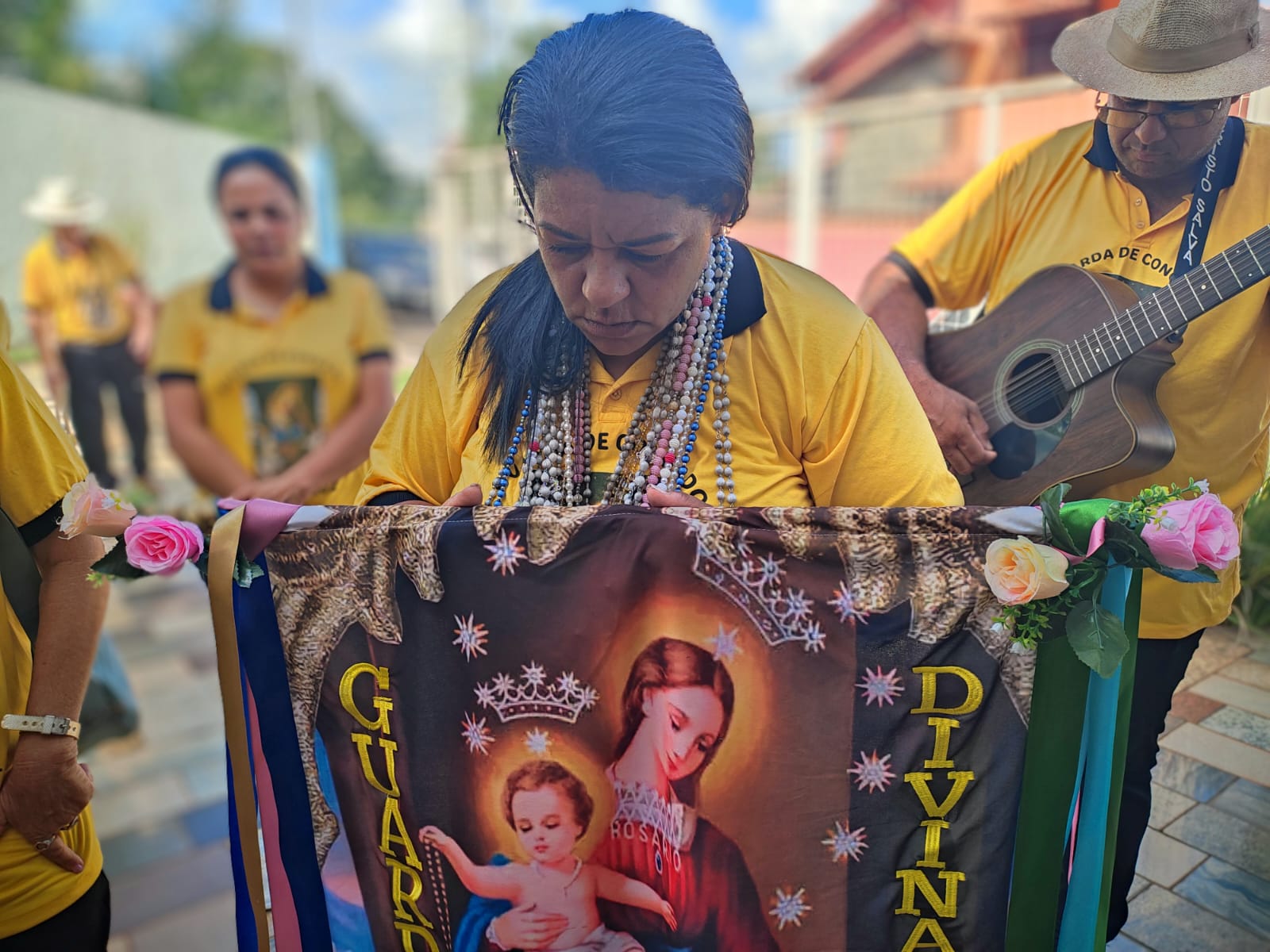 Foi um momento de profunda devoção e espiritualidade. Os congadeiros presentes, de forma espontânea, tiraram os seus rosários e os colocaram sobre a nova capitã em sinal de respeito e consideração. Sendo assim, os trabalhos do grupo vão continuar com firmes apesar da morte do Capitão Antônio. Assim que passar o tempo quaresmal a Guarda retoma seus ensaios e apresentações em diversos lugares divulgando a devoção à Nossa Senhora do Rosário, padroeira dos congadeiros. Que Deus abençoe a nova Capitã e lhe dê sabedoria para conduzir o Grupo Divina Luz que tem enriquecido tanto São José da Varginha e região. Um momento profundamente espiritual. A Capitã da Guarda Divina Luz, Naura Reis, assume seu posto sob as bençãos de Nossa Senhora do Rosário. Capitão Antônio aparece nas fotos abaixo, com a faixa verde no ombro.