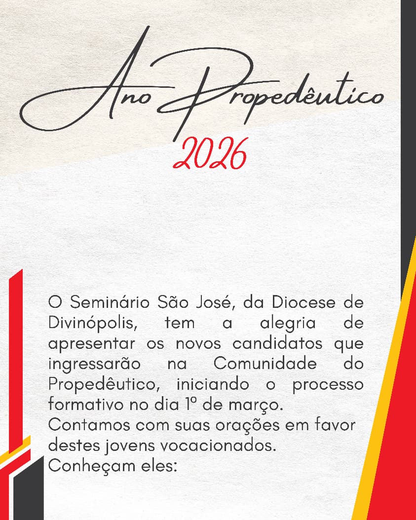 O Seminário São José, da Diocese de Divinopolis, tem alegria de apresentar os novos candidatos que ingressarão na Comunidade do Propedêutico, iniciando o processo formativo no dia 1° de março. O ano propedêutico é uma etapa introdutória e preparatória, geralmente com um ano de duração, que antecede o início de estudos superiores ou formações específicas, como seminários. Ele visa consolidar conhecimentos básicos, amadurecer aptidões humanas e espirituais, e introduzir o aluno ao ritmo acadêmico.