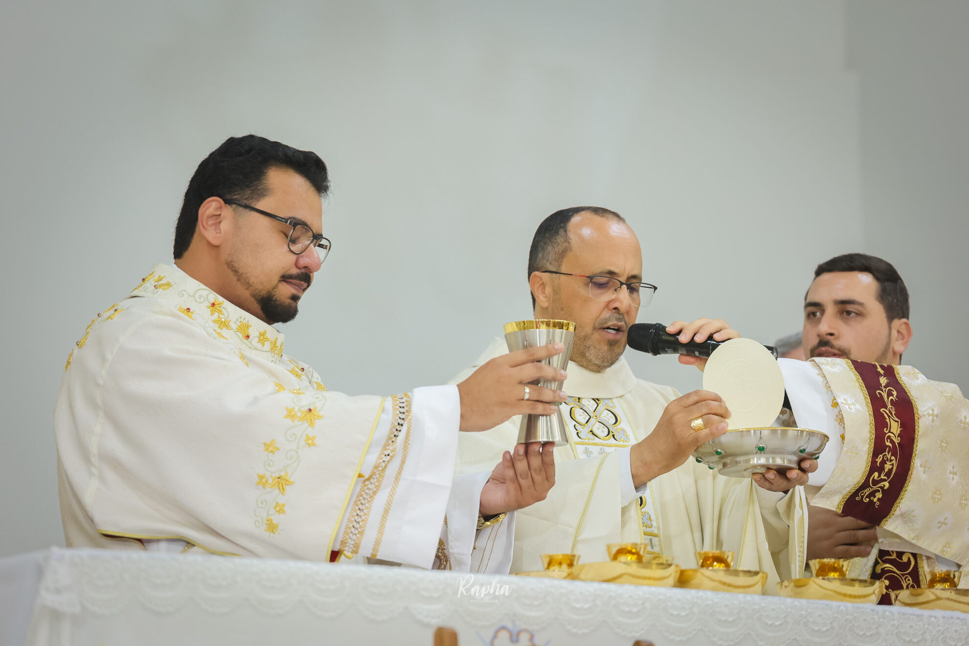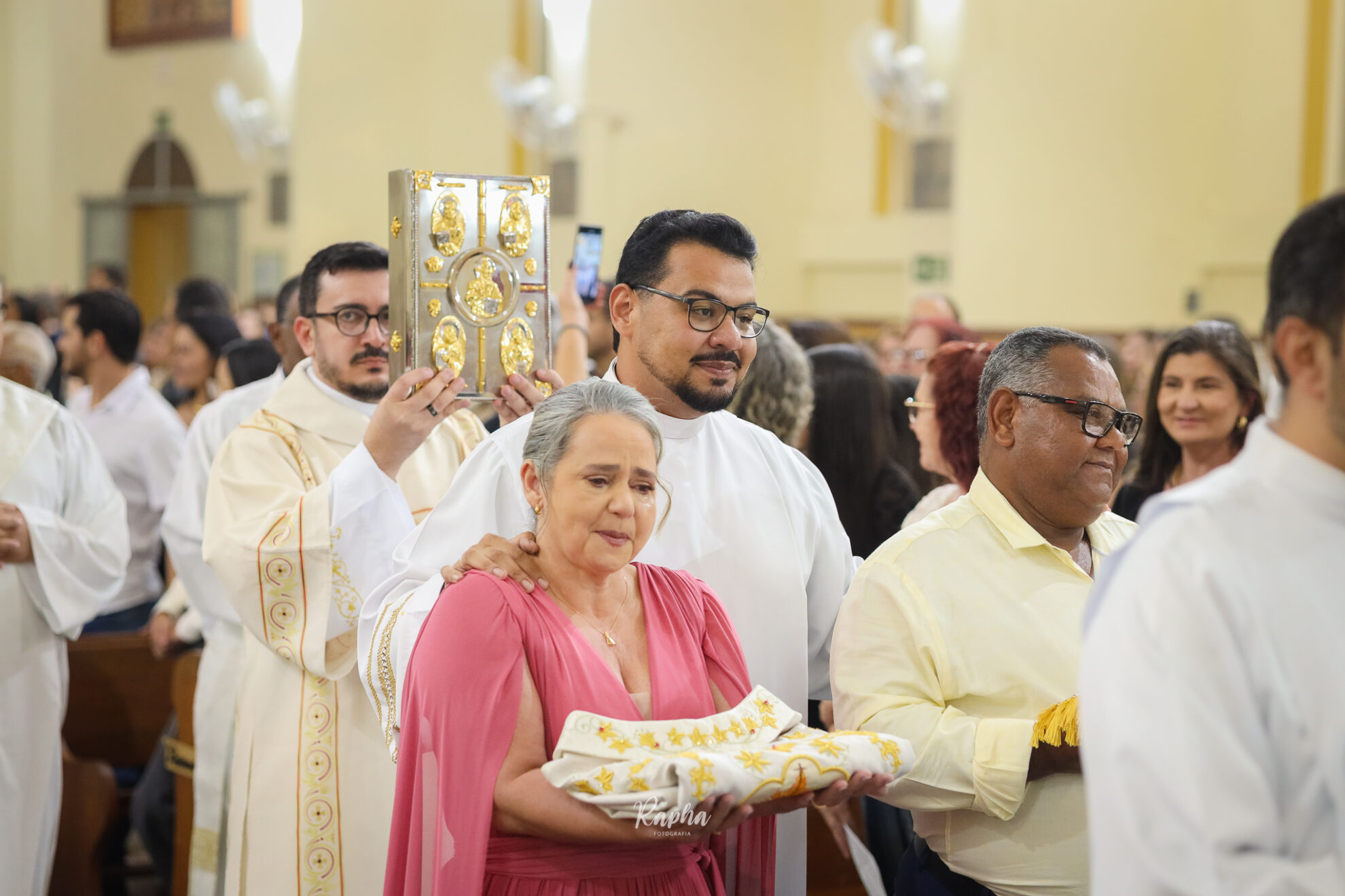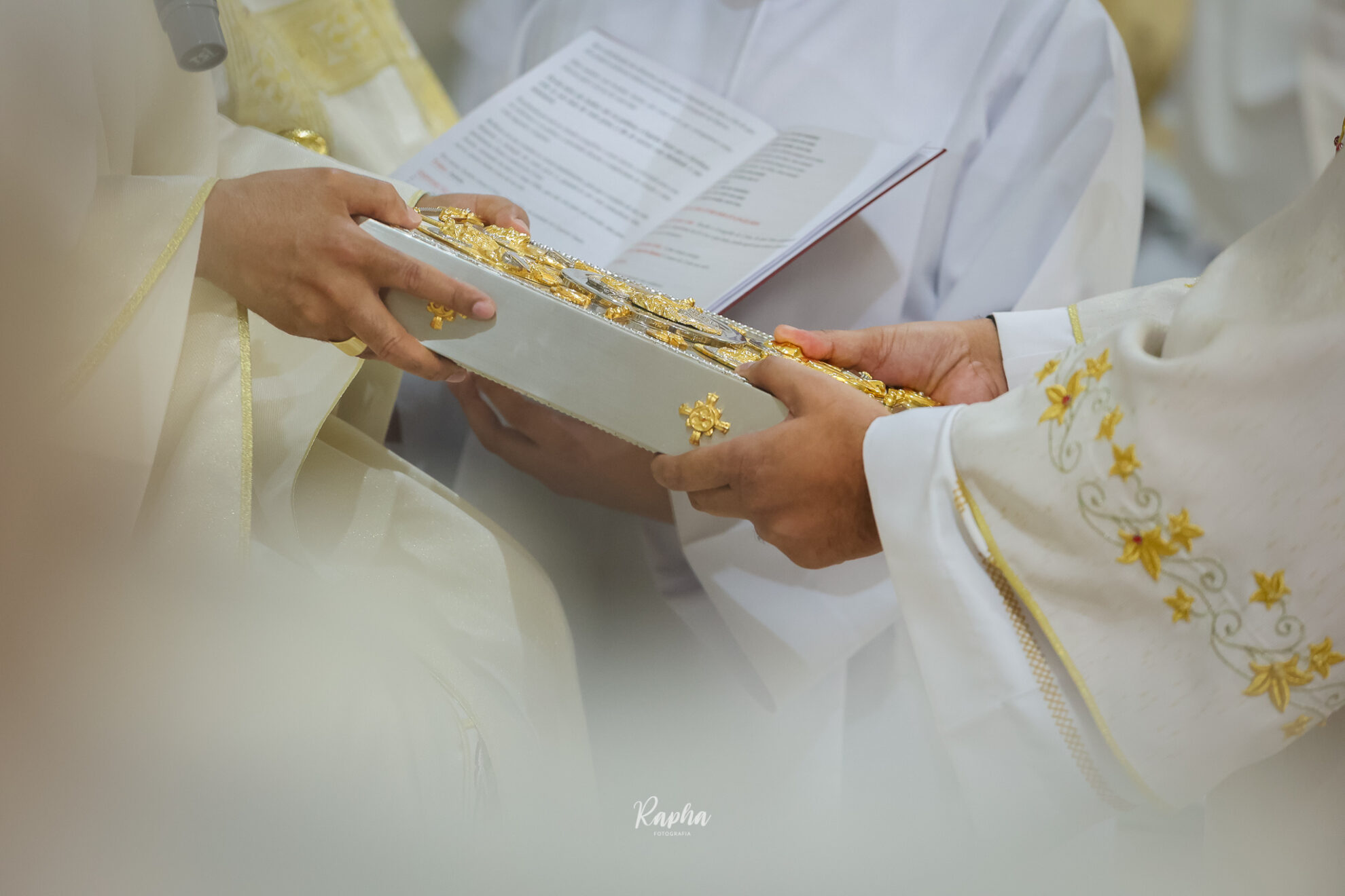 O bispo entrega o Evangeliário (livro dos Evangelhos) ao diácono, simbolizando a proclamação do Evangelho.