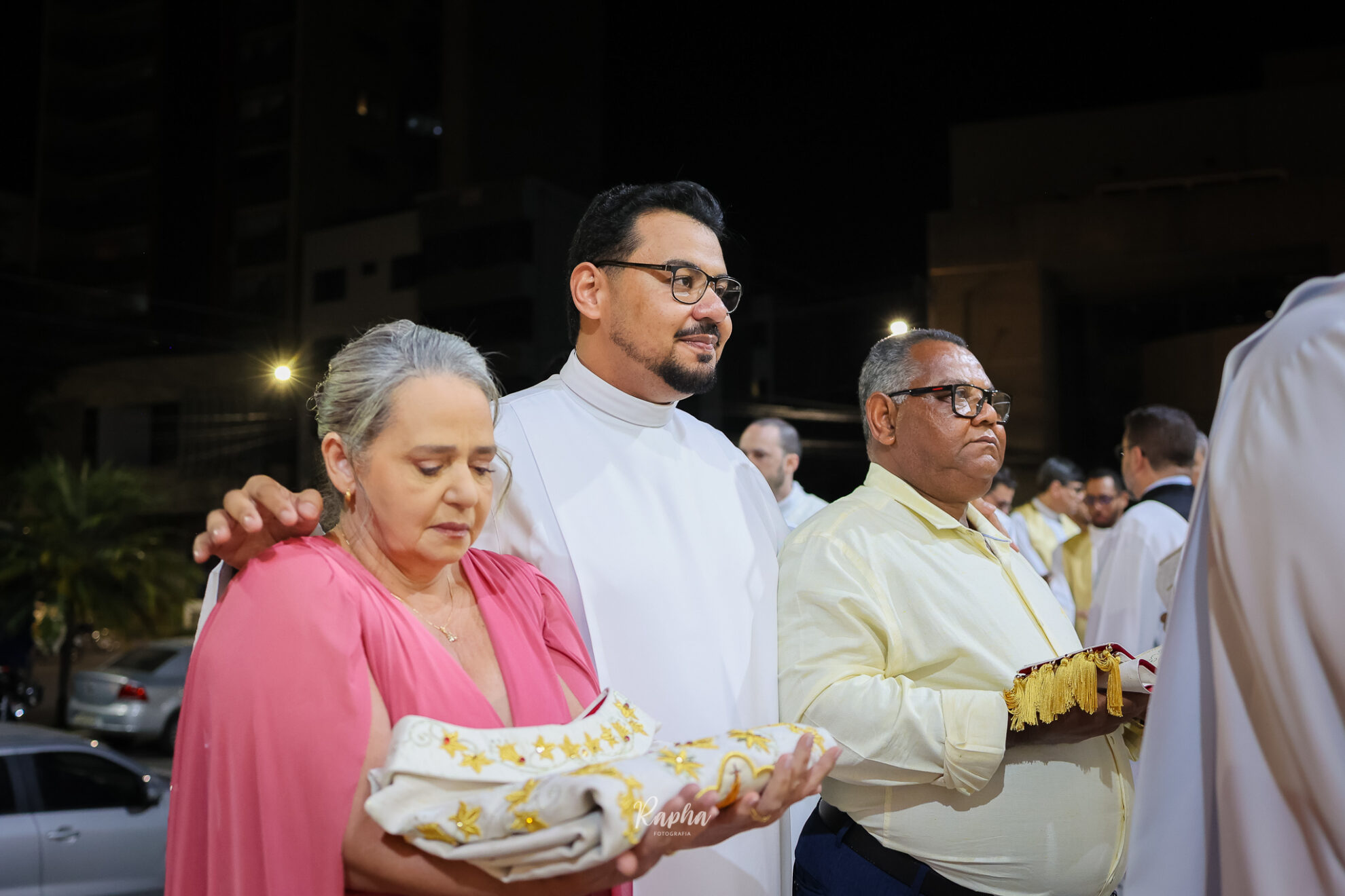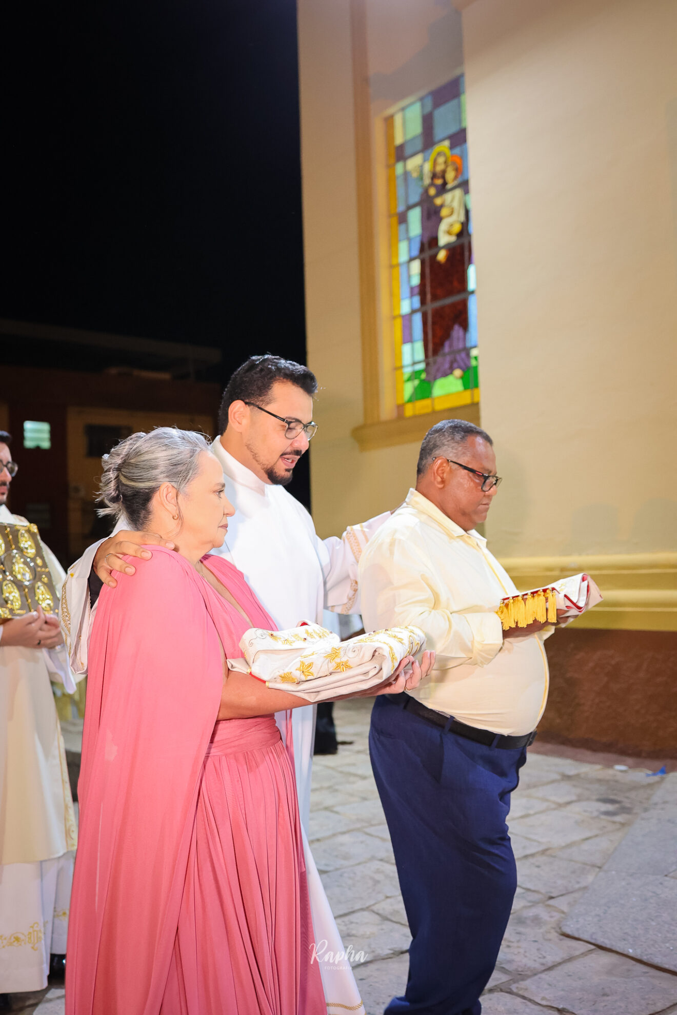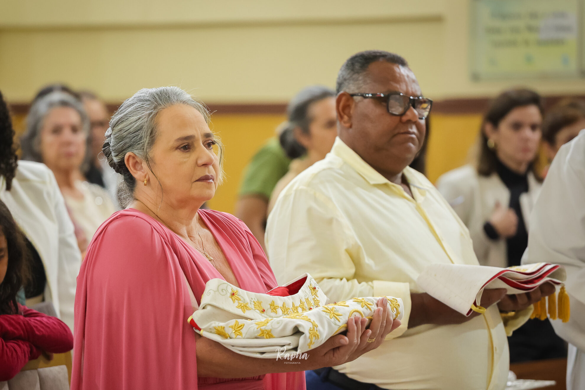 O candidato recebe a estola diaconal (uma faixa que cruza o peito e desce até o lado) e a dalmática (uma veste litúrgica mais ampla).
