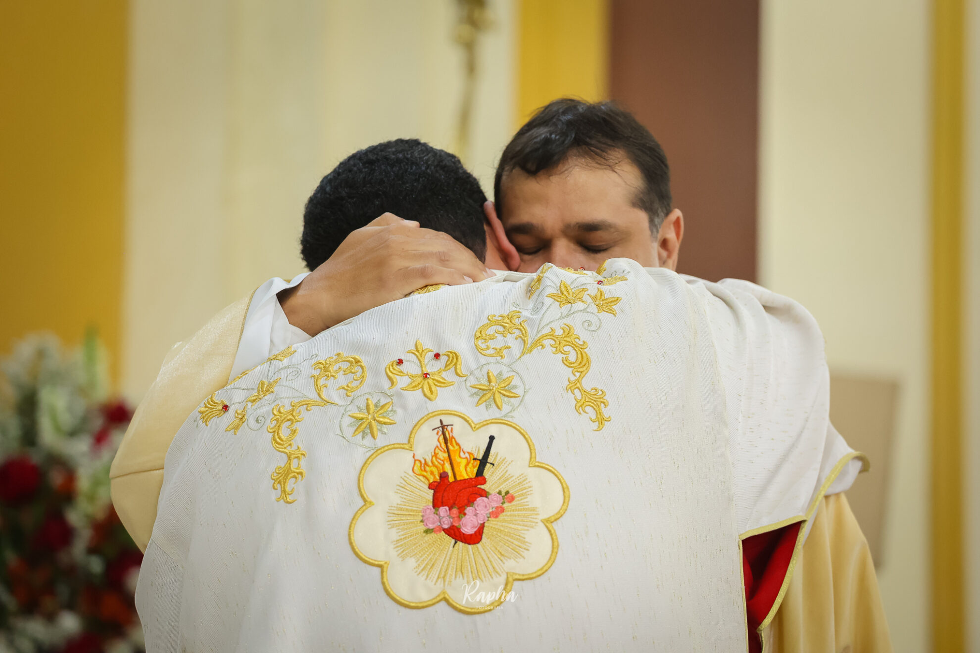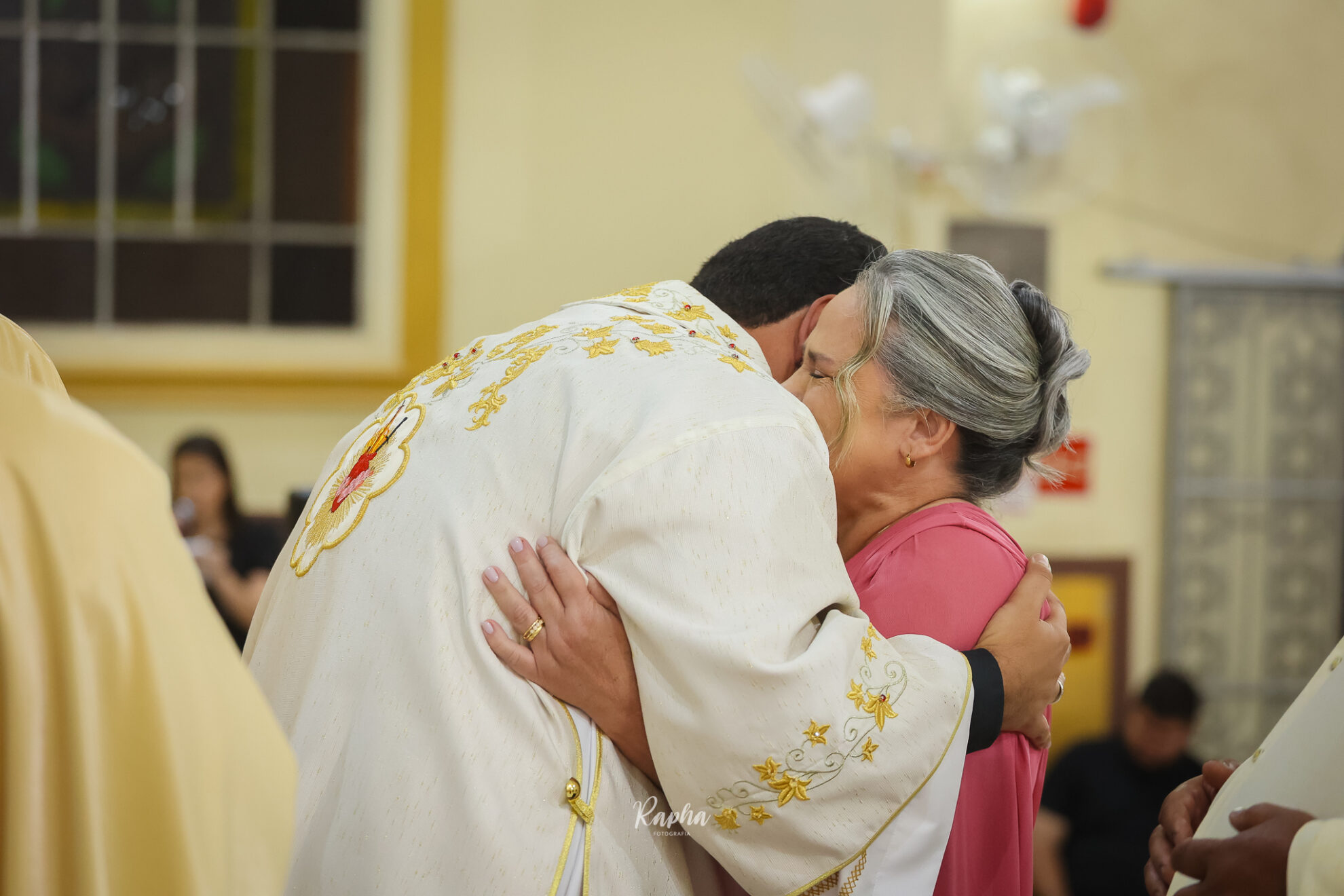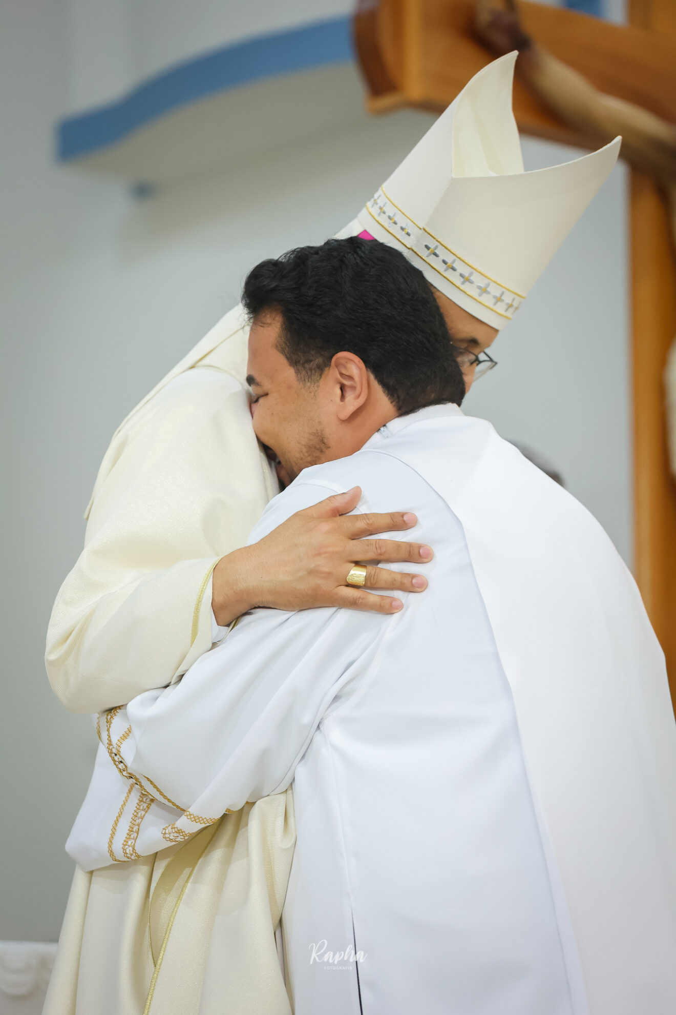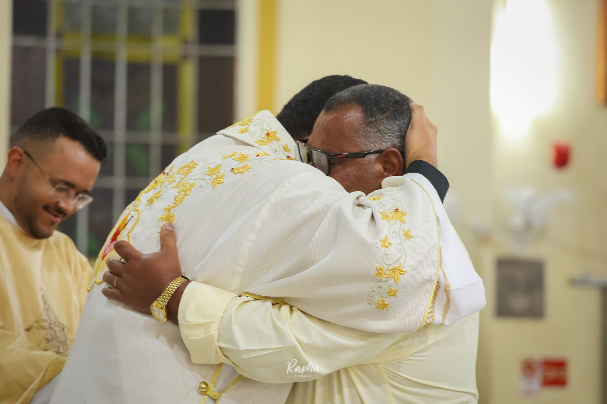 O bispo e os demais padres dão o beijo da paz ao novo diácono.