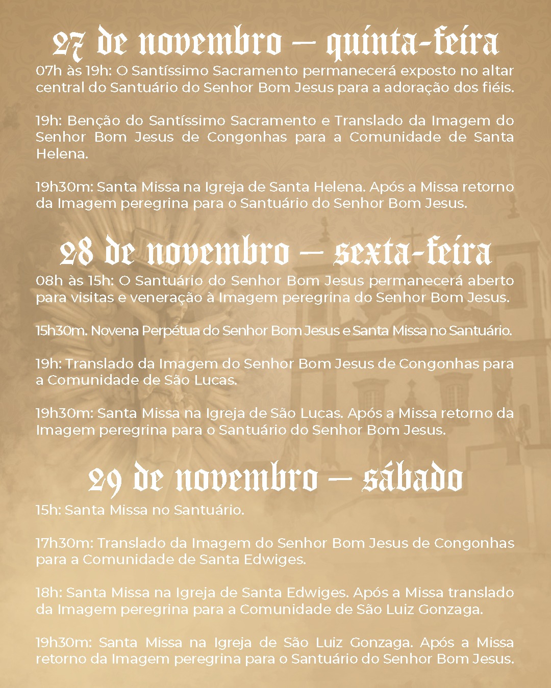 07h às 19h.: O Santíssimo Sacramento permanecerá exposto no altar central do Santuário do Senhor Bom Jesus para a adoração dos fiéis.