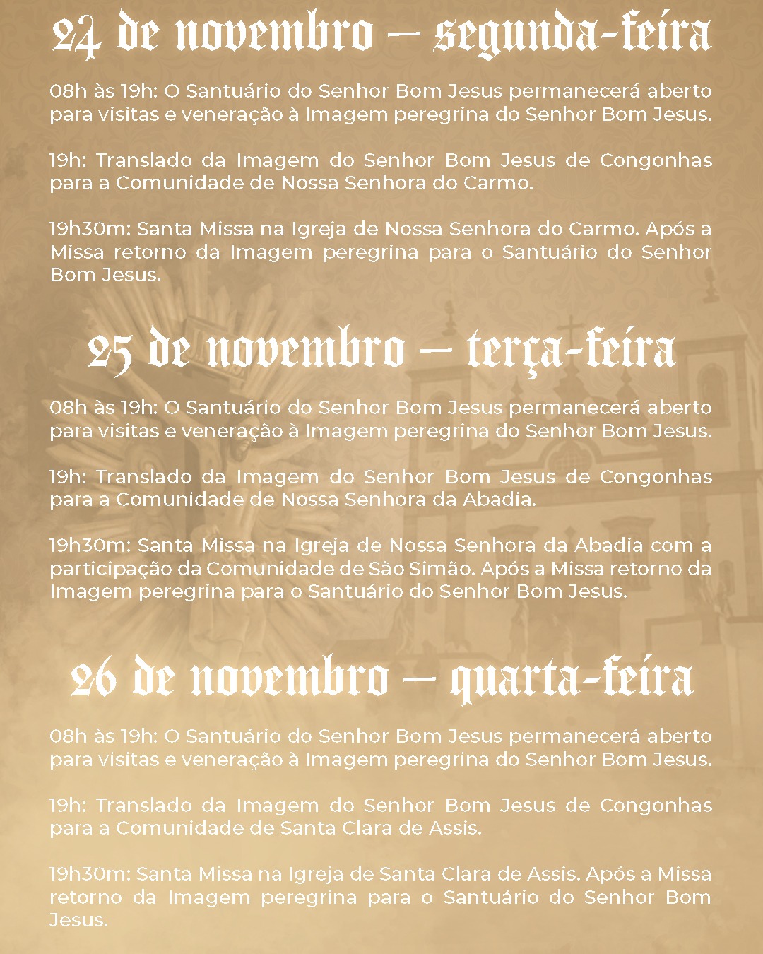 19h30m.: Santa Missa na Igreja de Santa Clara de Assis. Após a Missa retorno da Imagem peregrina para o Santuário do Senhor Bom Jesus.