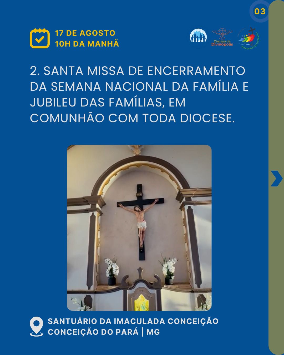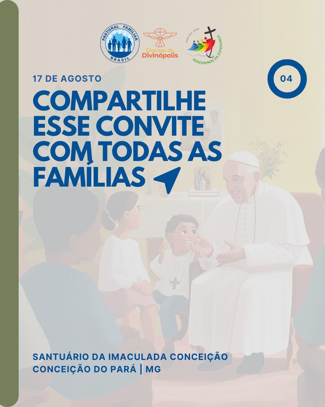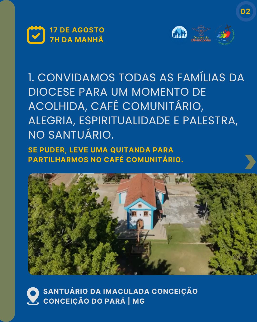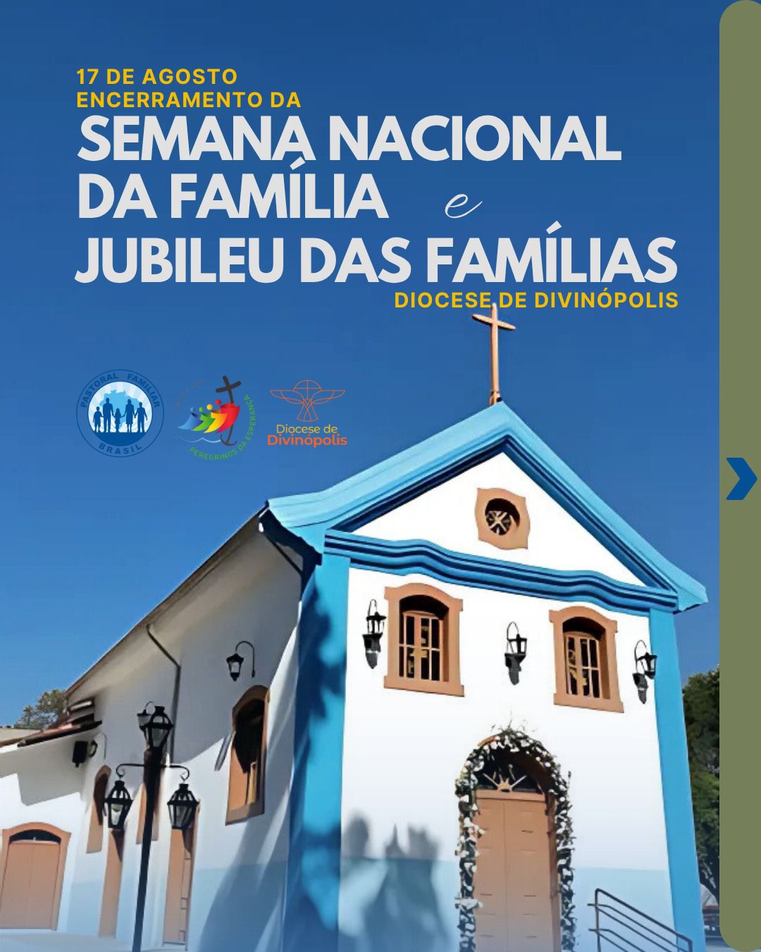 Na Diocese de Divinópolis, a Comissão Vida e Família e a Pastoral Familiar, convidam para o Jubileu das Famílias e o Encerramento da Semana Nacional das Famílias, marcado para o dia 17 de agosto, no Santuário da Imaculada Conceição, em Conceição do Pará. Haverá um momento de acolhida, café comunitário e uma oportunidade de espiritualidade com uma palestra de formação, encerrando com a celebração da Santa Missa. As famílias estão sendo convidadas a levarem alimentos, para que possam partilhar nesse café comunitário, previsto para ter início às 7h. O evento mostra alinhamento com o subsídio oficial da Semana. A proposta vai além dos encontros religiosos. As comunidades são incentivadas a promover ações missionárias, sociais e culturais que aproximem ainda mais a Igreja das famílias. A ideia é que a vivência da fé aconteça dentro e fora dos templos, nas casas, ruas, escolas, hospitais, presídios, asilos, abrigos e periferias.