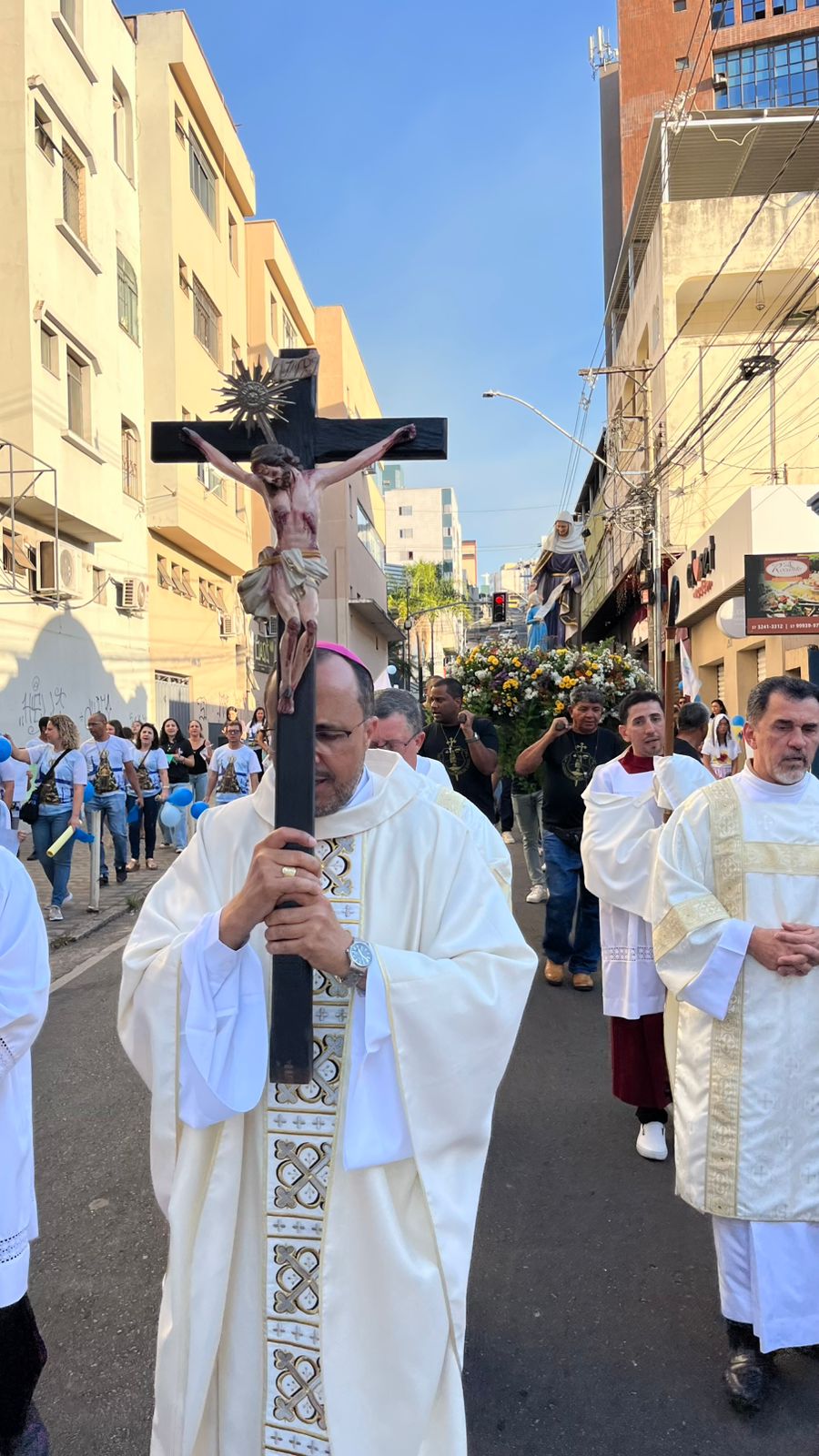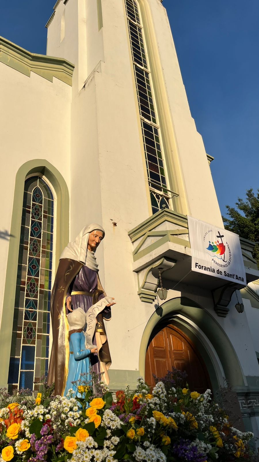 Por volta das 16h30, a caminhada desceu o morro, rumo à matriz de Sant’Ana que foi toda preparada para a Eucaristia. Foram distribuídas duas mil cadeiras pela Praça, em frente a igreja, que aos poucos foram sendo ocupadas pelo povo. A imagem da padroeira, Sant’Ana, foi levada na caminhada em um andor, seguida pelas imagens dos padroeiros das sete paróquias que compõem a forania. Seminaristas e padres também fizeram a breve peregrinação. Dom Geovane, seguiu à frente da imagem da padroeira, com um crucifixo, e junto com o povo, entoou cânticos religiosos.