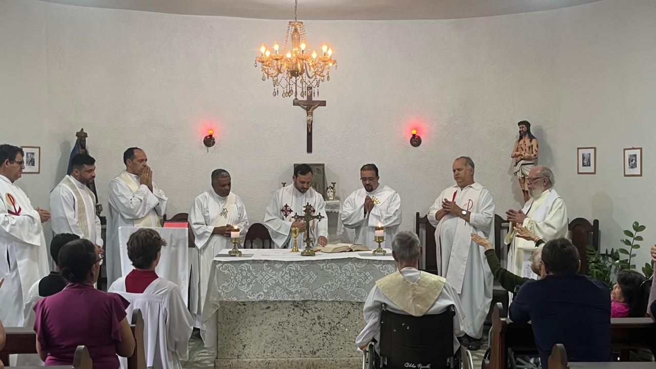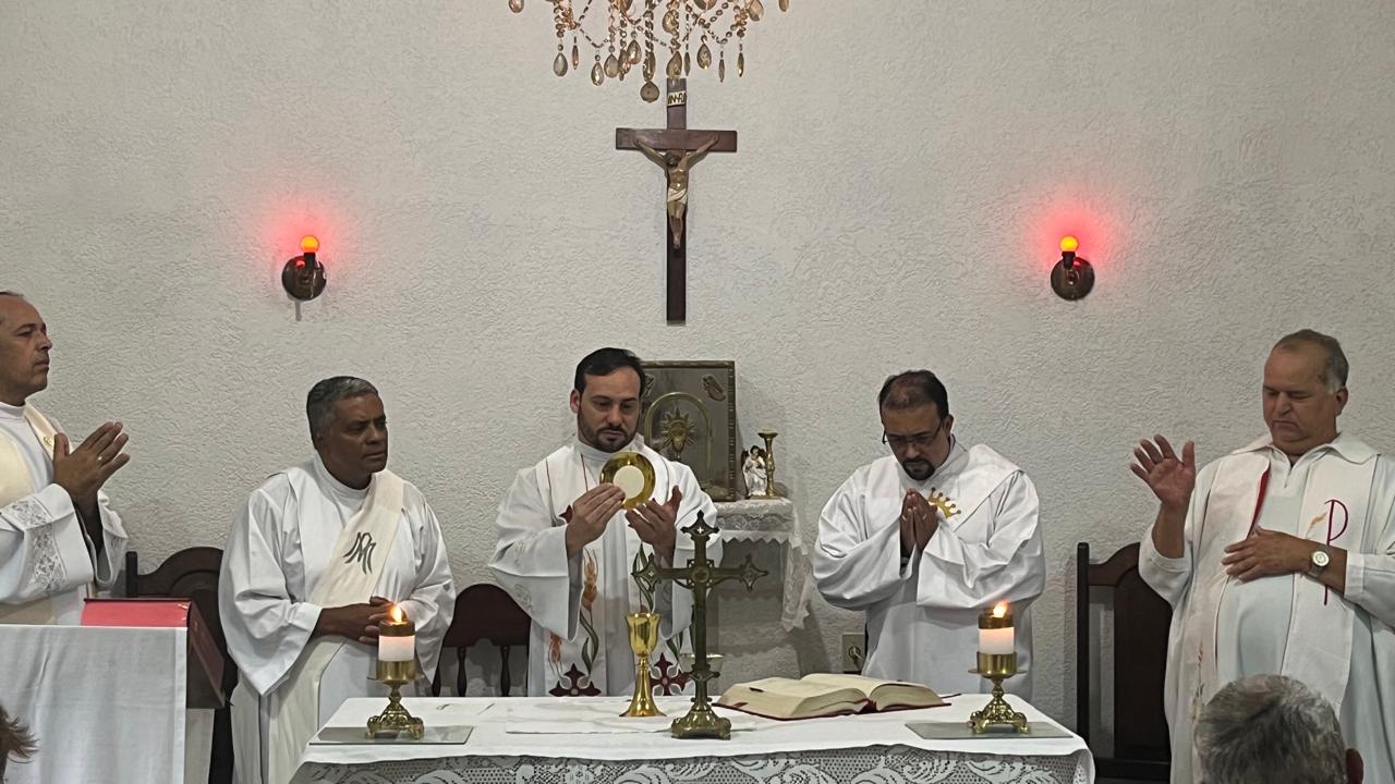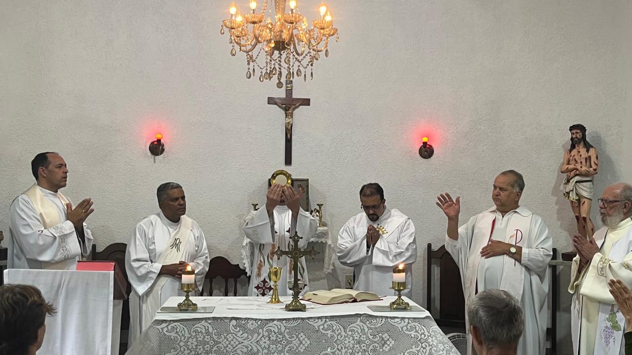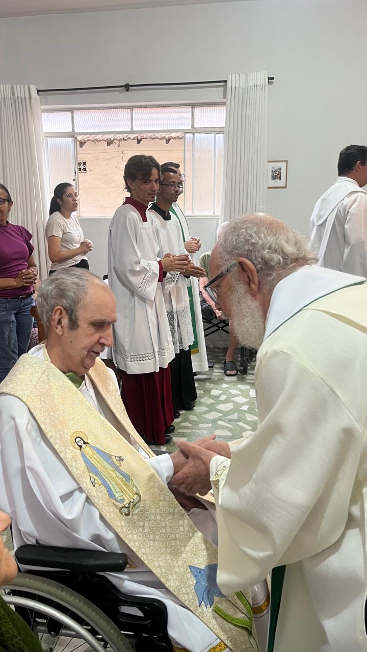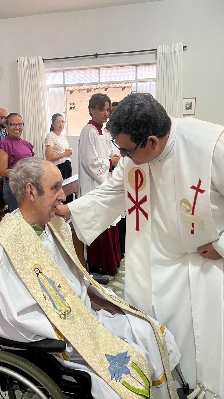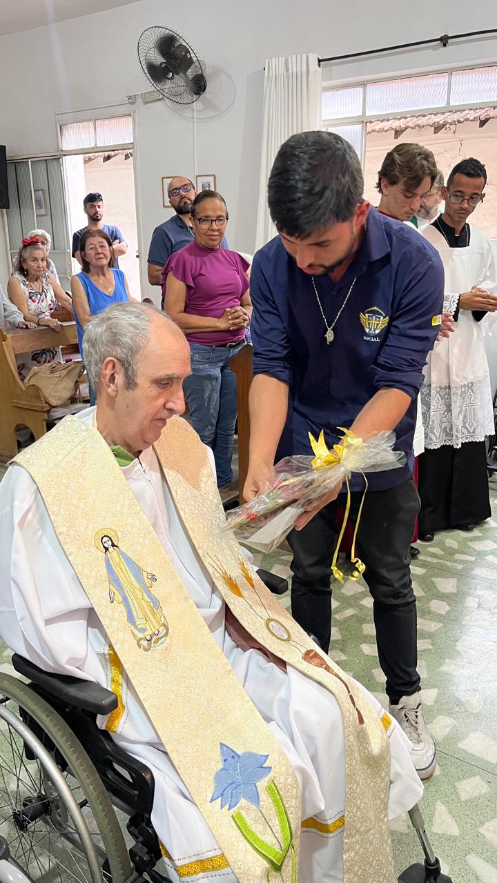 A missa foi conduzida pelo padre Rodrigo (da Paróquia Nossa Senhora da Guia) e concelebrada por outros padres e diáconos da Forania do Divino Espírito Santo. Ao final, ele recebeu um presente, uma imagem de Santa Teresinha, entregue por um representante da Missão Maria de Nazaré, responsável pelo asilo.