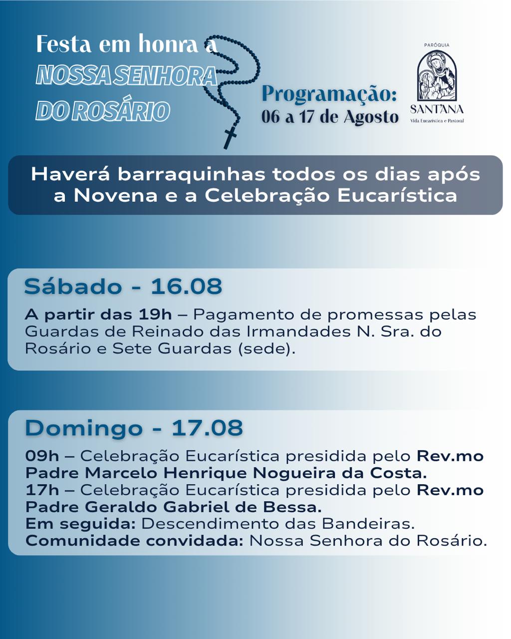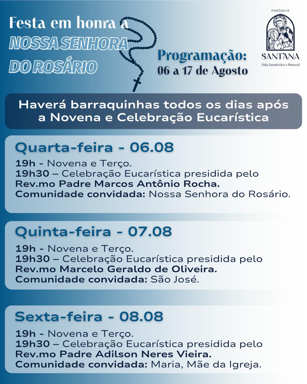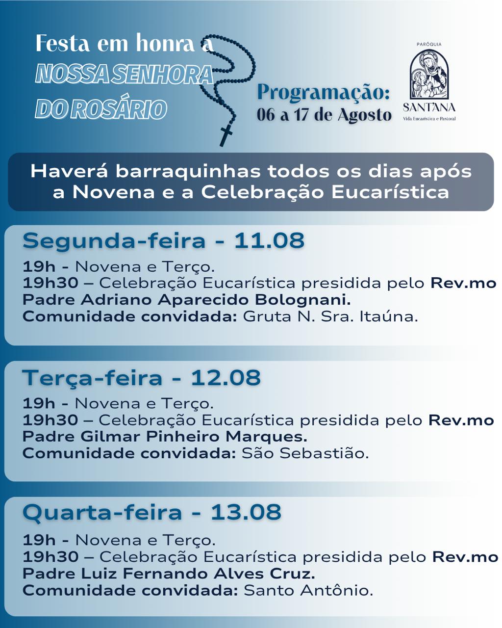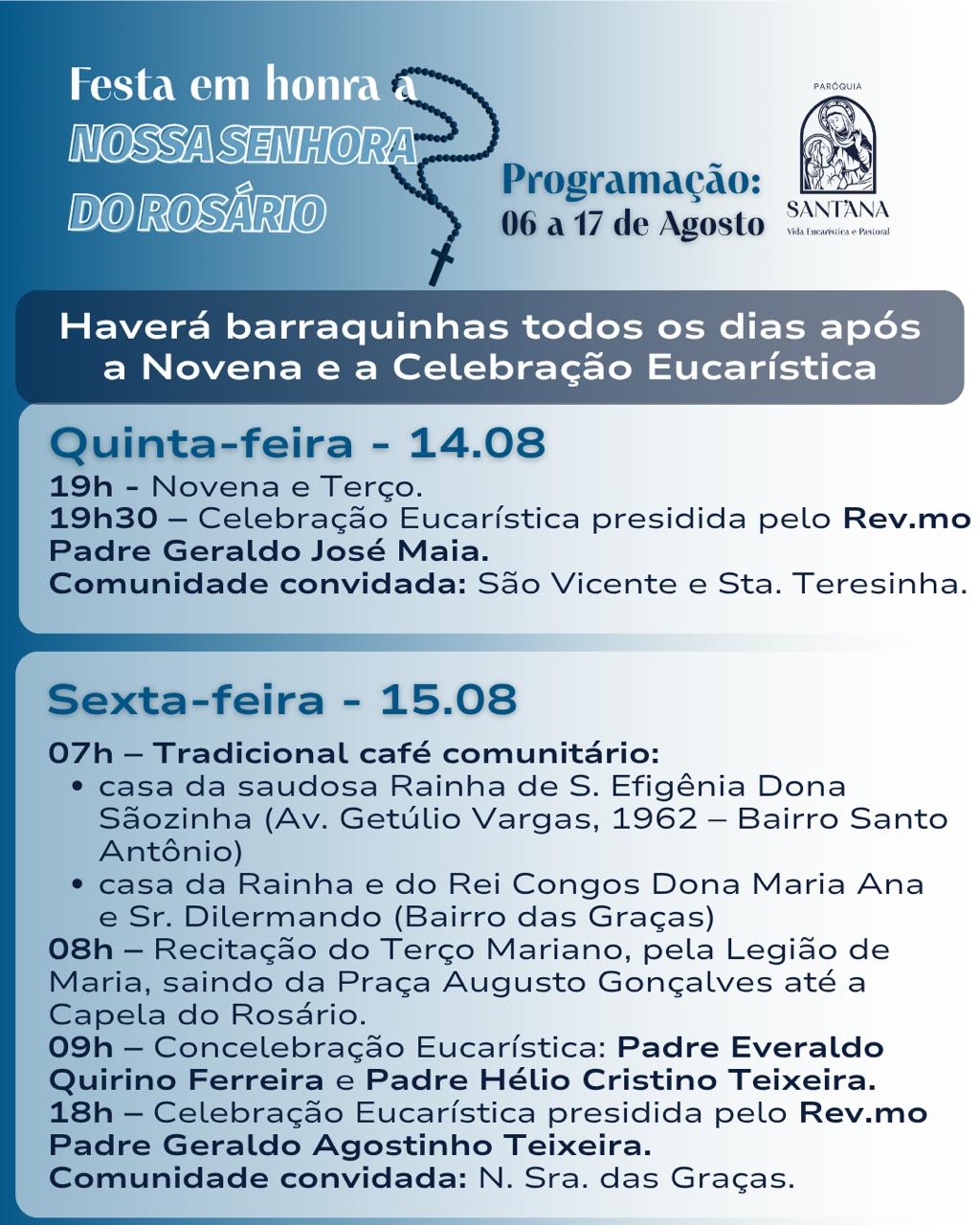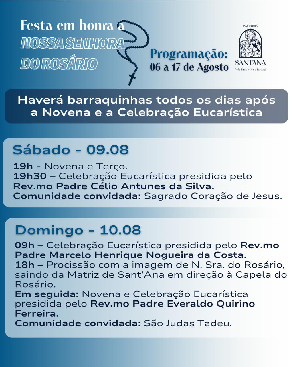 A Paróquia de Sant’Ana, em Itaúna, celebra de 06 a 17 de agosto a tradicional festa em honra a Nossa Senhora do Rosário. Todos os dias haverá novena e terço as 19h e a partir das 19h30 celebração eucarística, a cada dia com um padre convidado (programa completo abaixo).