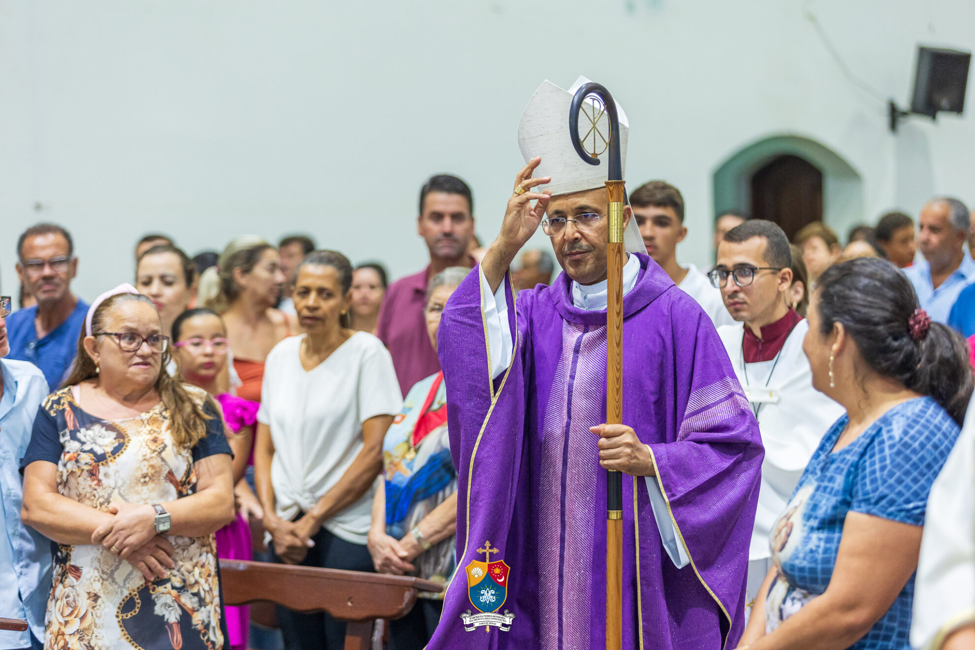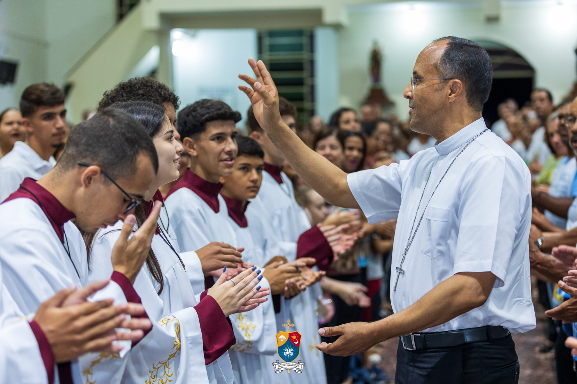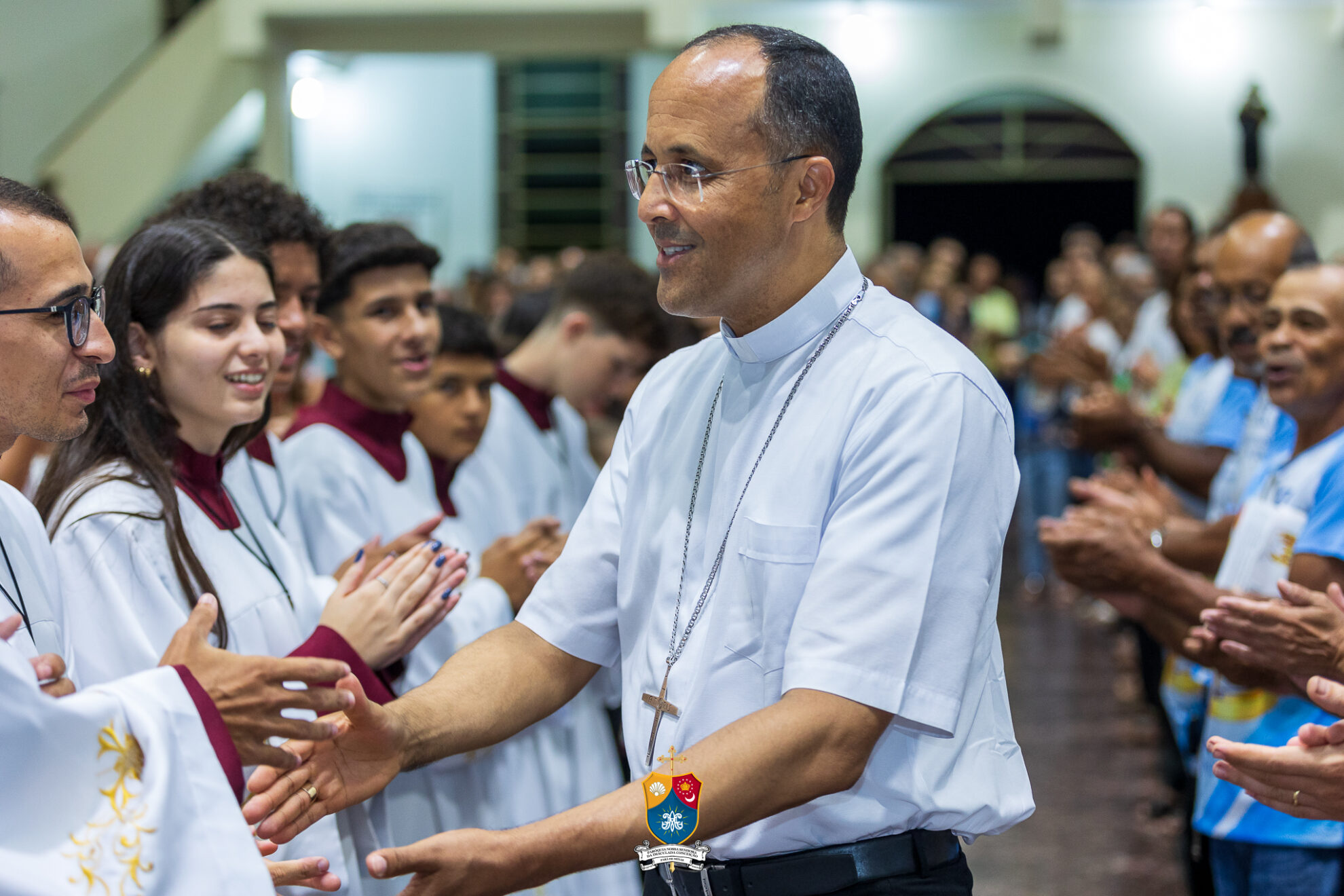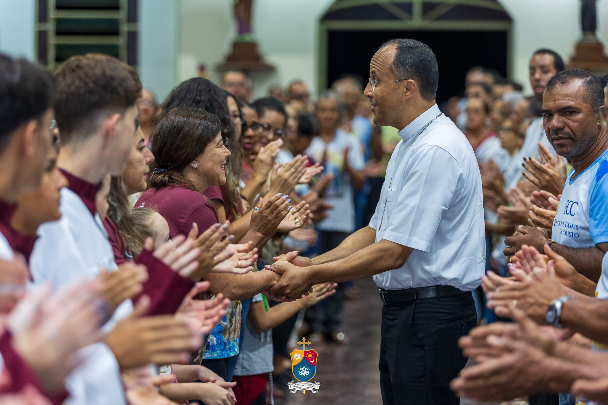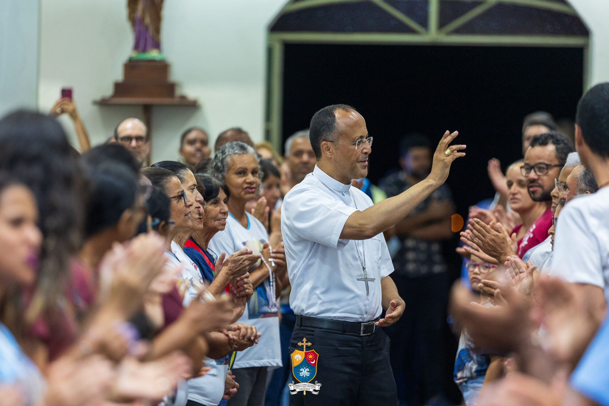 Junto à porta, Dom Geovane foi acolhido por numerosos fiéis que fizeram como que um cordão humano para uma calorosa e afetuosa saudação. Saudando e abençoando a todos, o bispo diocesano prosseguiu até ao altar para os preparativos e paramentação para início do 8º dia do novenário.