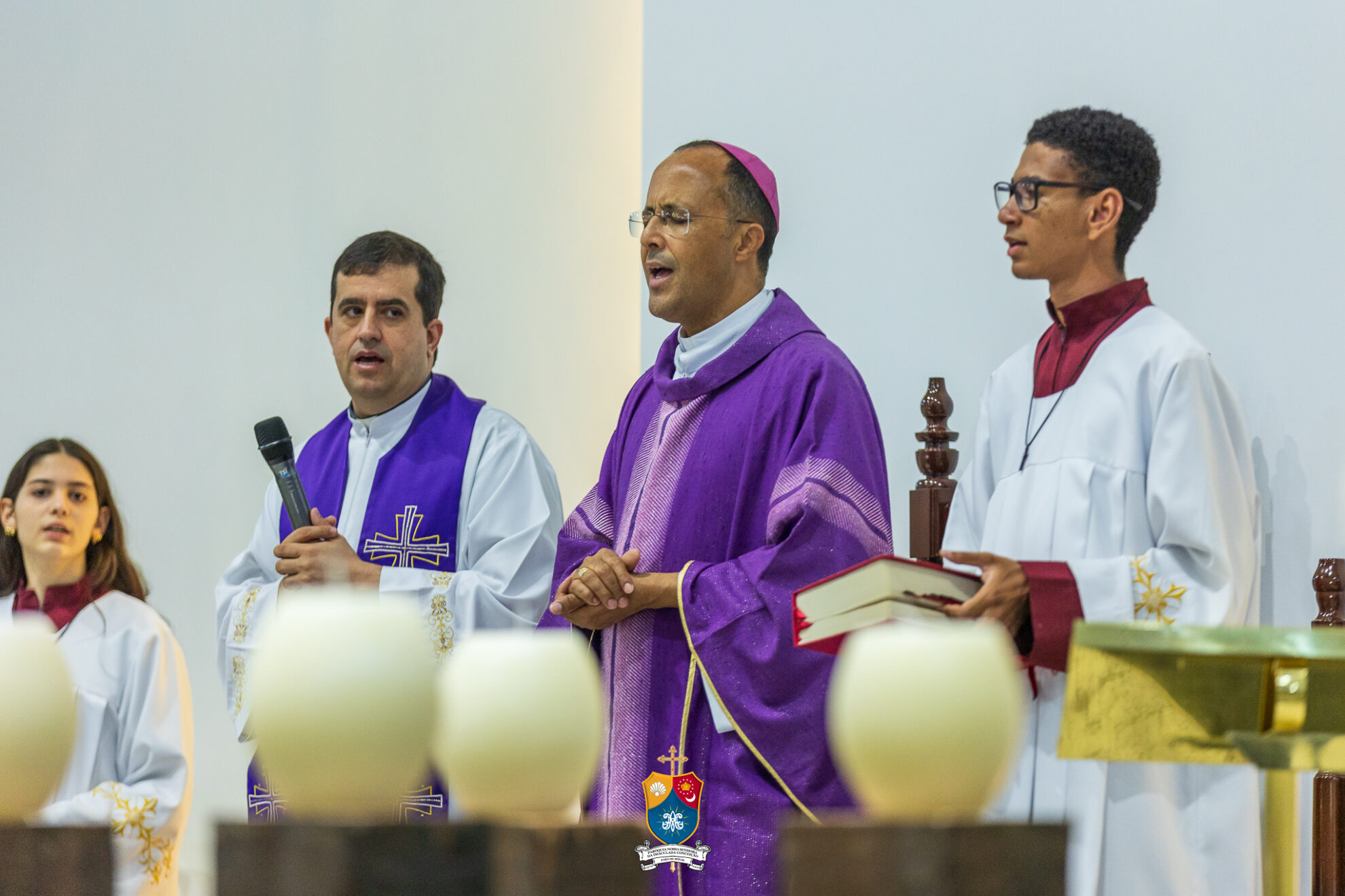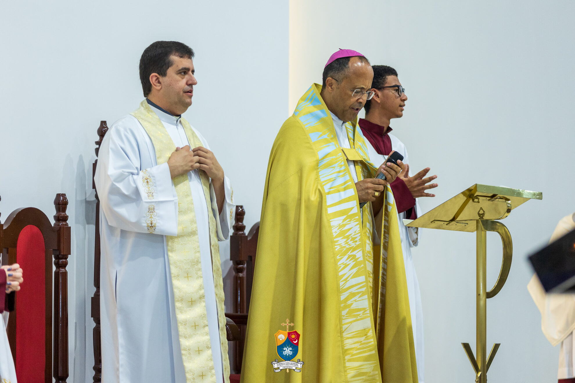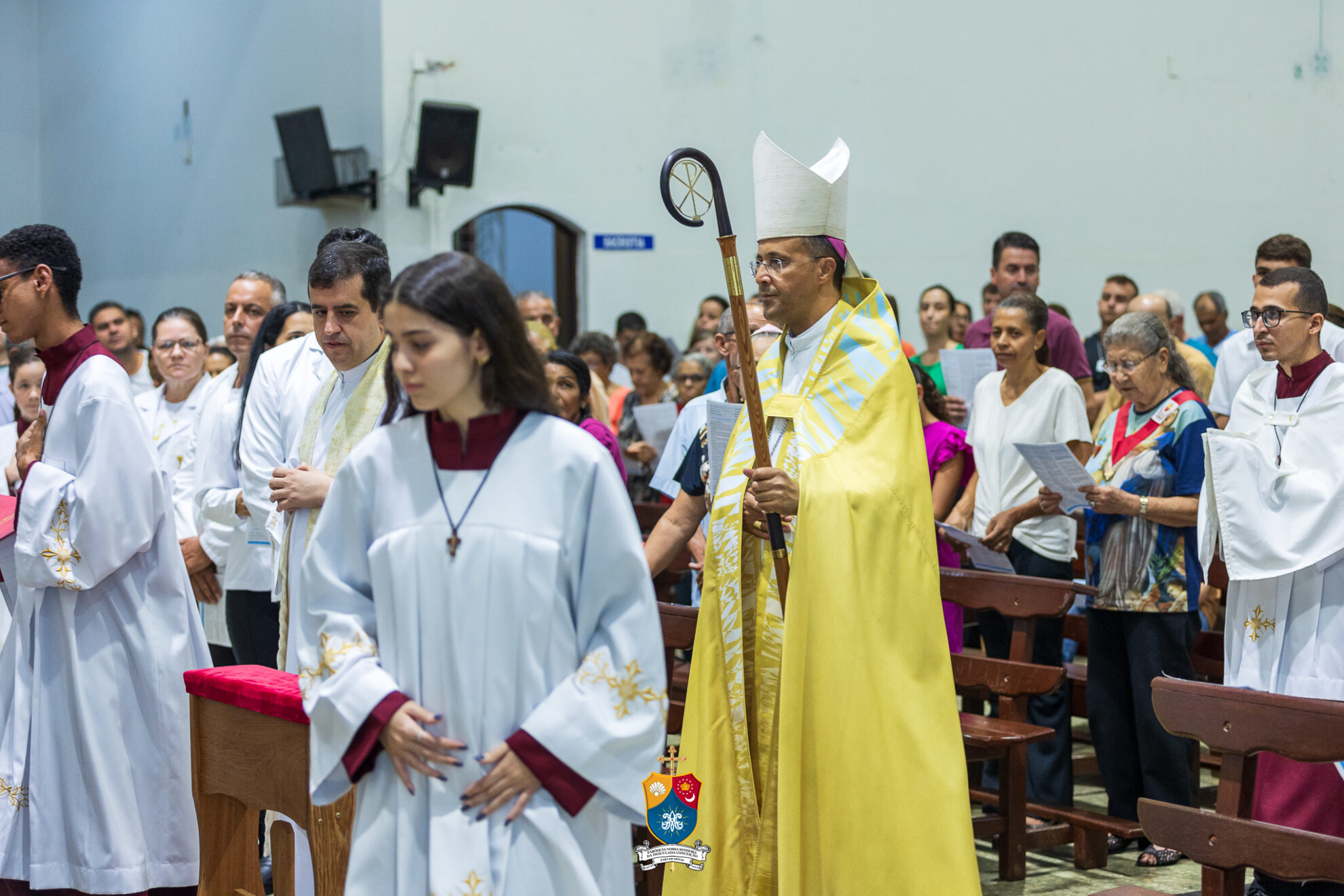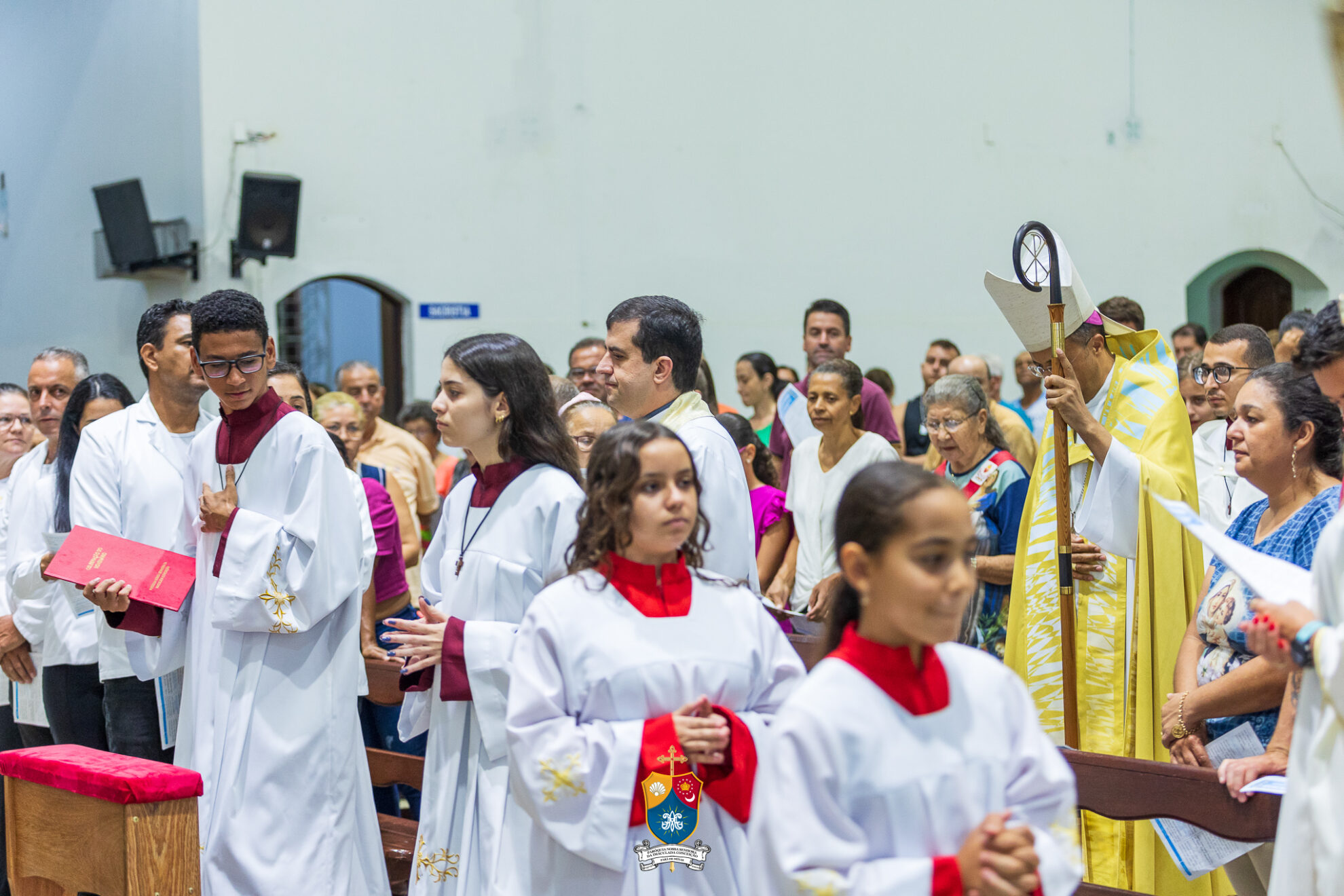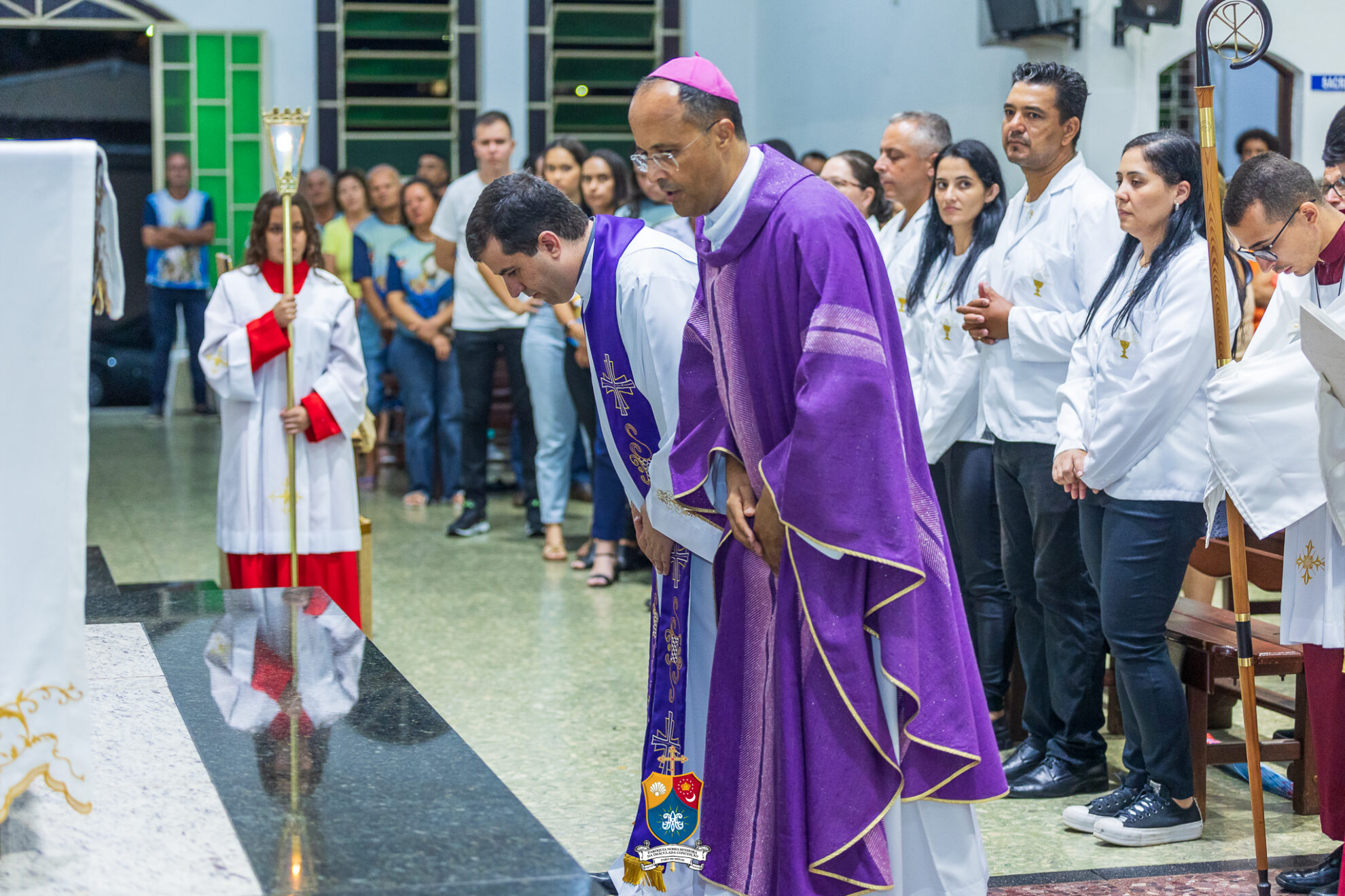 Junto à porta, Dom Geovane foi acolhido por numerosos fiéis que fizeram como que um cordão humano para uma calorosa e afetuosa saudação. Saudando e abençoando a todos, o bispo diocesano prosseguiu até ao altar para os preparativos e paramentação para início do 8º dia do novenário.