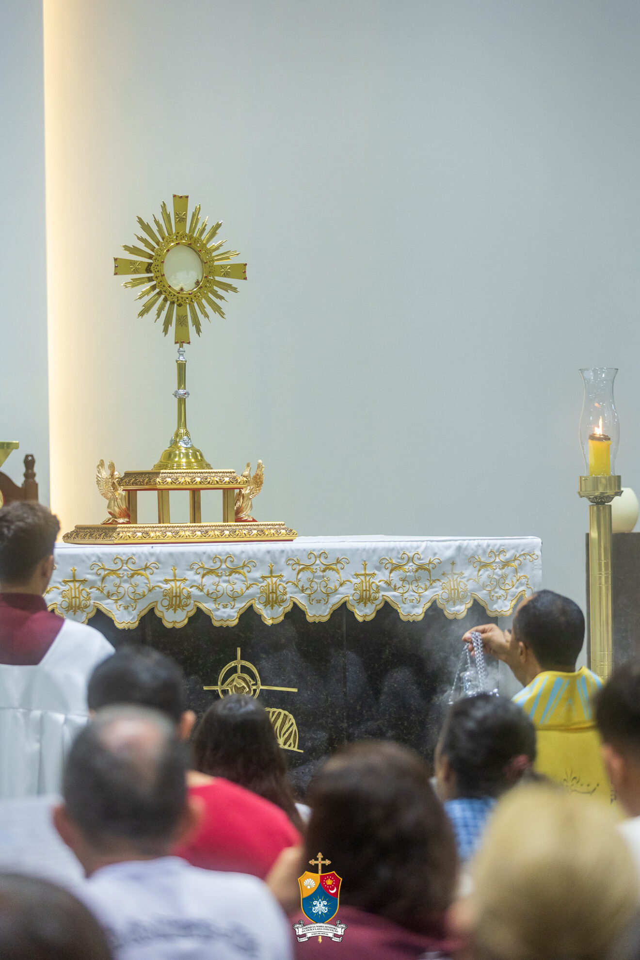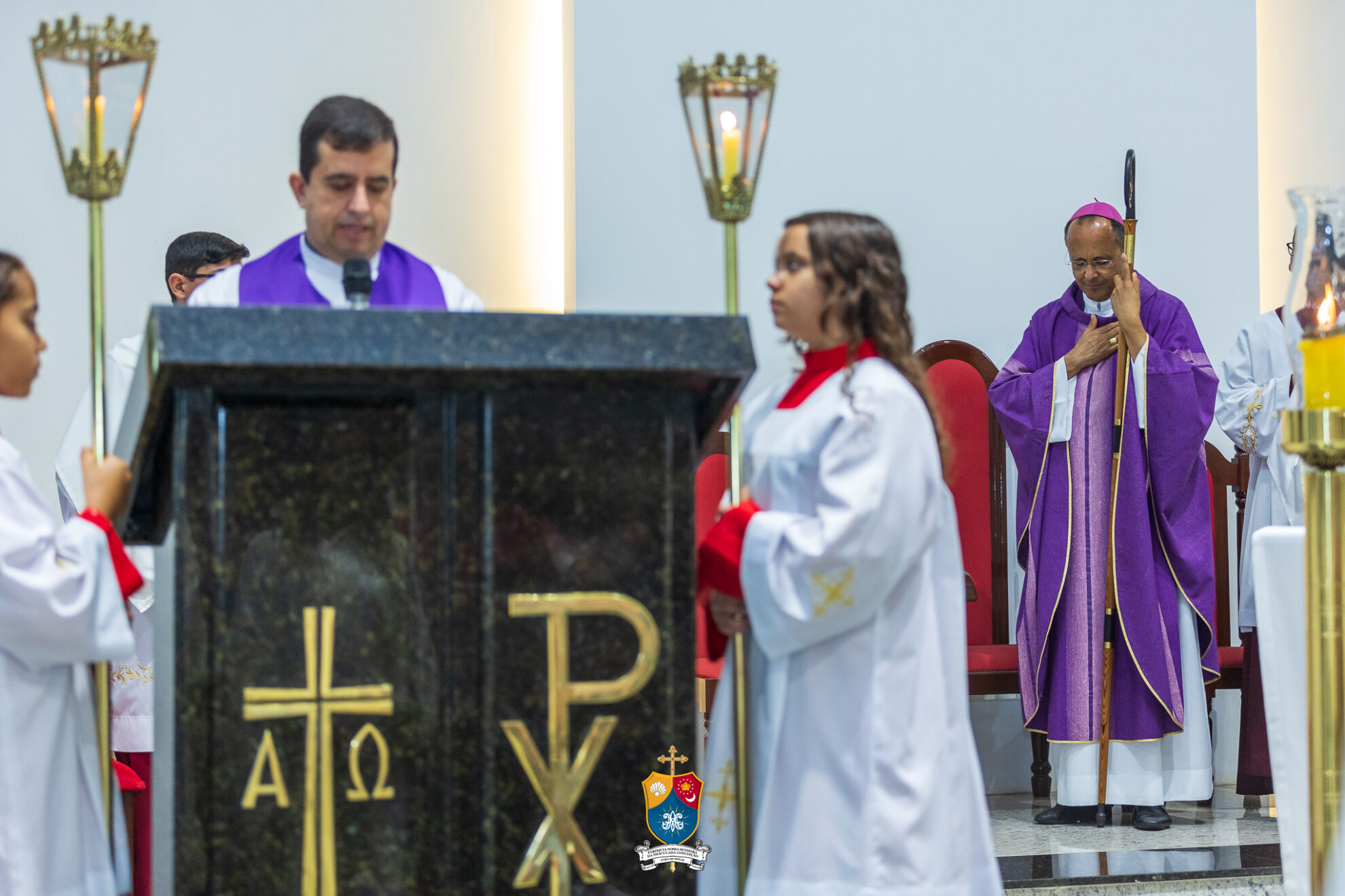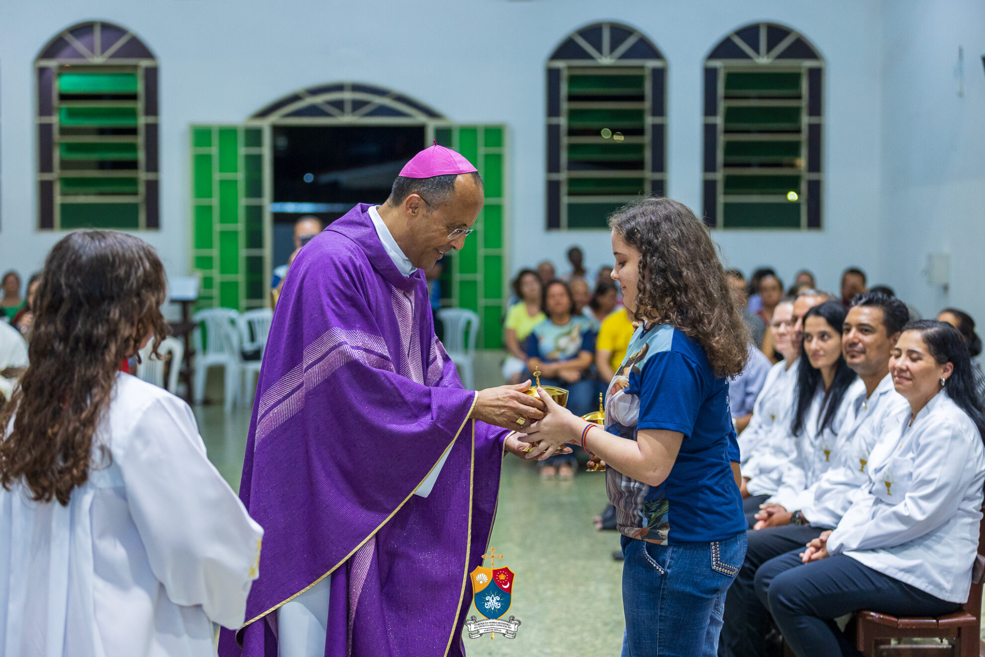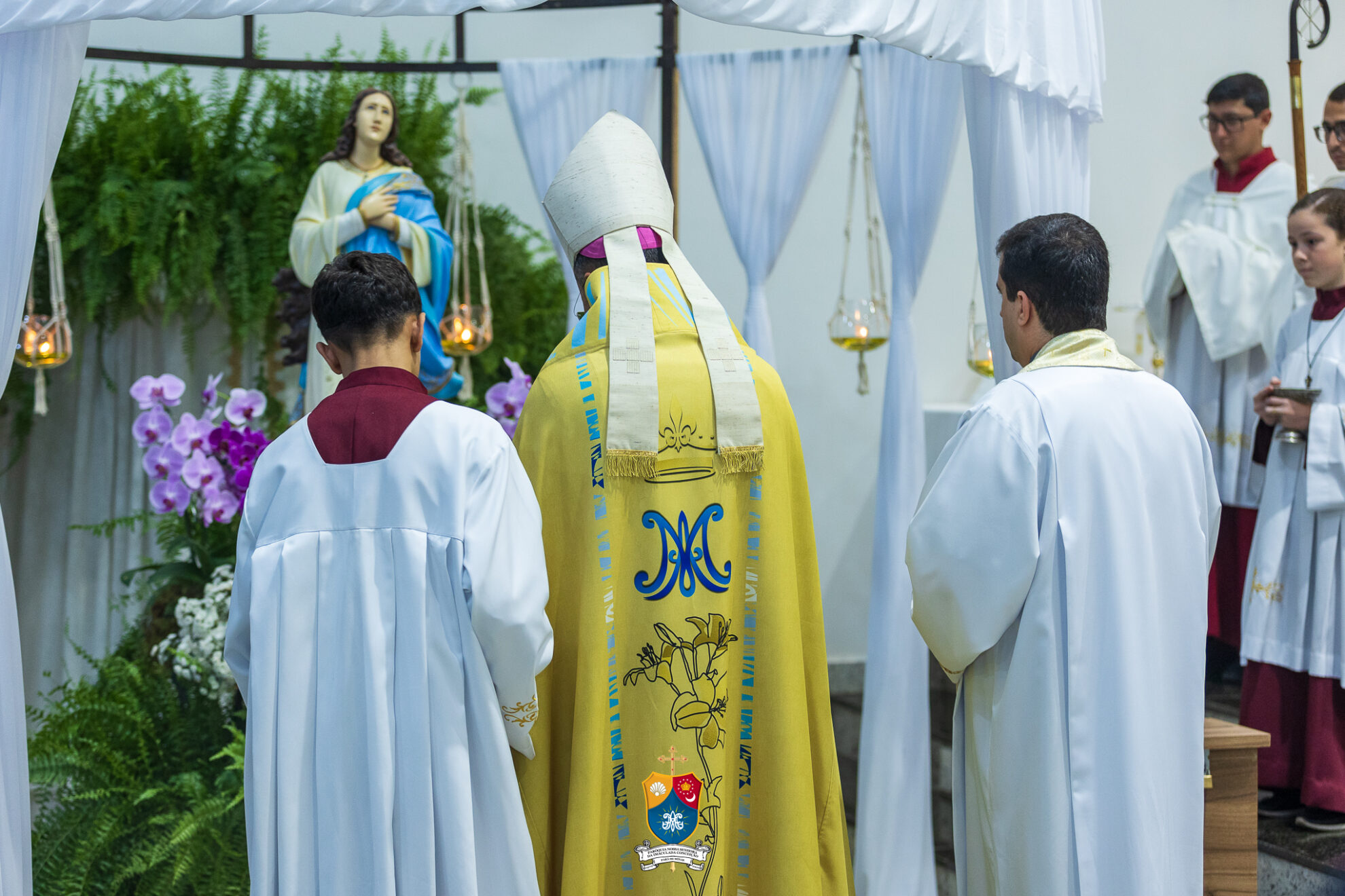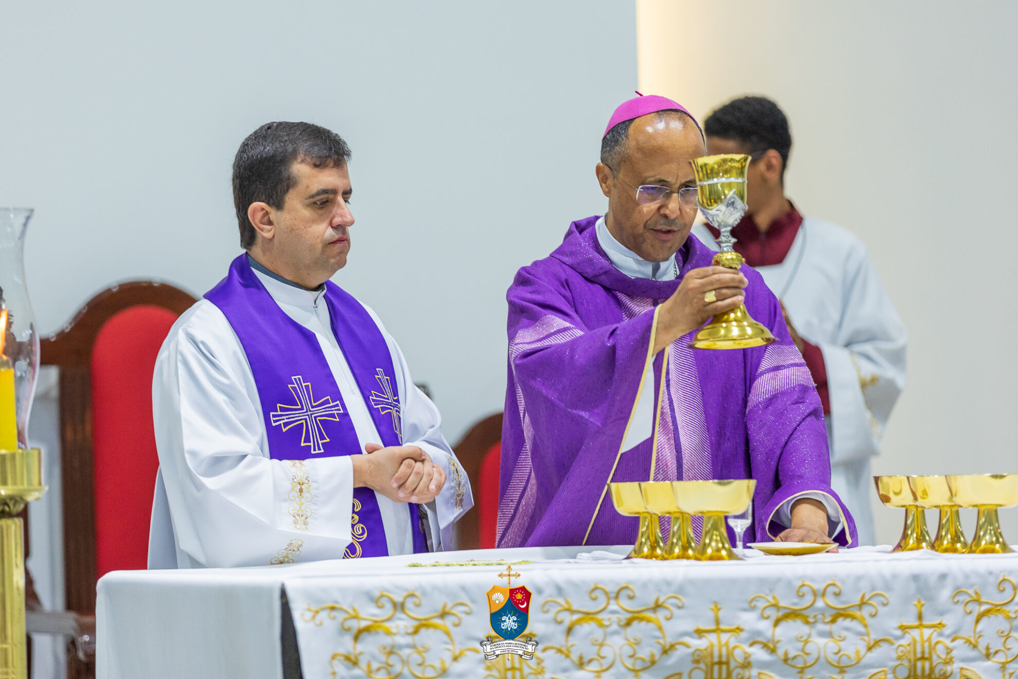 Junto à porta, Dom Geovane foi acolhido por numerosos fiéis que fizeram como que um cordão humano para uma calorosa e afetuosa saudação. Saudando e abençoando a todos, o bispo diocesano prosseguiu até ao altar para os preparativos e paramentação para início do 8º dia do novenário.