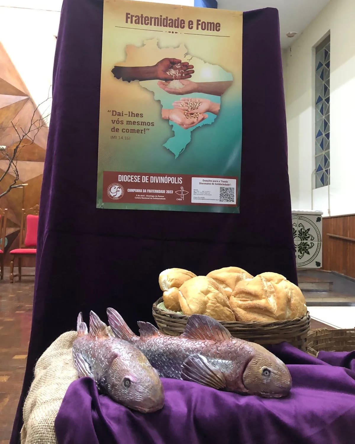 Na Matriz, de modo especial, foram postos os pães e os peixes, que nos recordam a multiplicação do alimento realizada por Jesus bem à frente das multidões famintas. Nela, aprendemos que a partilha do pouco de cada um se transforma no muito para todos! E a decoração da Mesa da Palavra nos diz que não só de pão vive o homem, mas de toda Palavra que sai da boca divina. Outra fome também deve ser cuidada: a do nosso desejo de Deus! Tudo convidativo para que andemos juntos nesta jornada quaresmal, ou seja, nestes dias que nos separam do Mistério Pascal de Jesus. Neste ano, a Igreja nos propõe, na Campanha da Fraternidade, a reflexão sobre a fome e o lema: “Dai-lhes vós mesmos de comer!” (Mt 14,16).