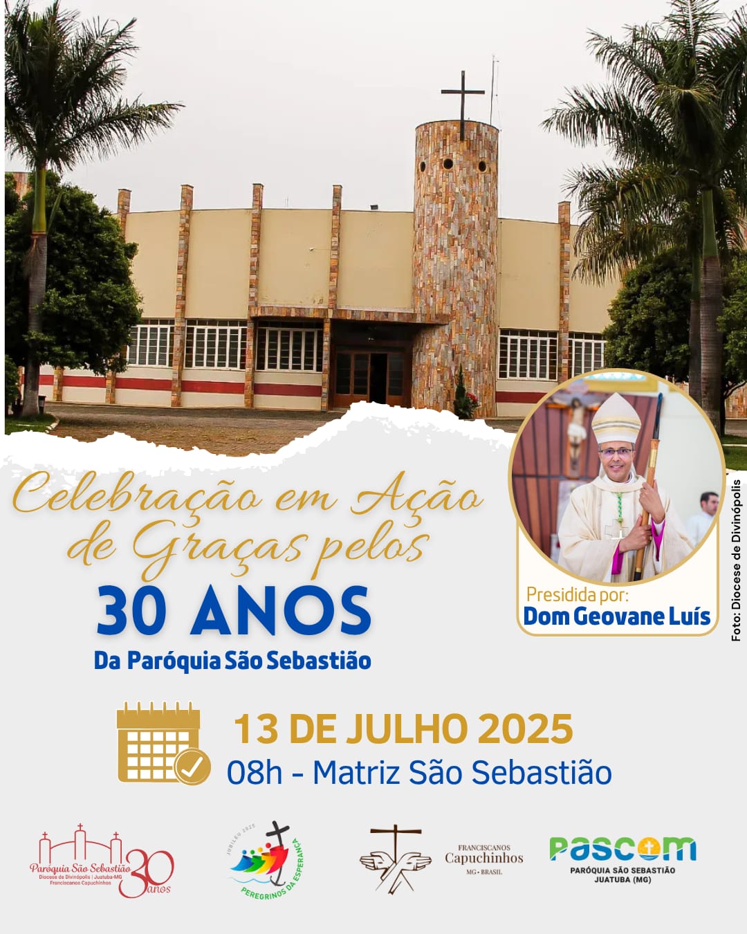 A Paróquia São Sebastião em Juatuba, realiza nesse domingo, dia 13 de julho, a celebração em Ação de Graças pelos 30 anos. A missa festiva está marcada para às 8h da manhã. A matriz de São Sebastião fica na Rua Antônio Rosa Araújo, 301 no Centro de Juatuba. A importante data contará com a presença do bispo diocesano, Dom Geovane Luis da Silva.