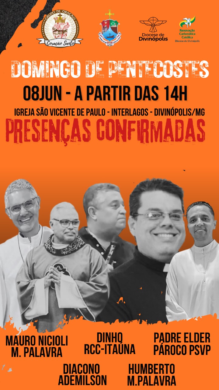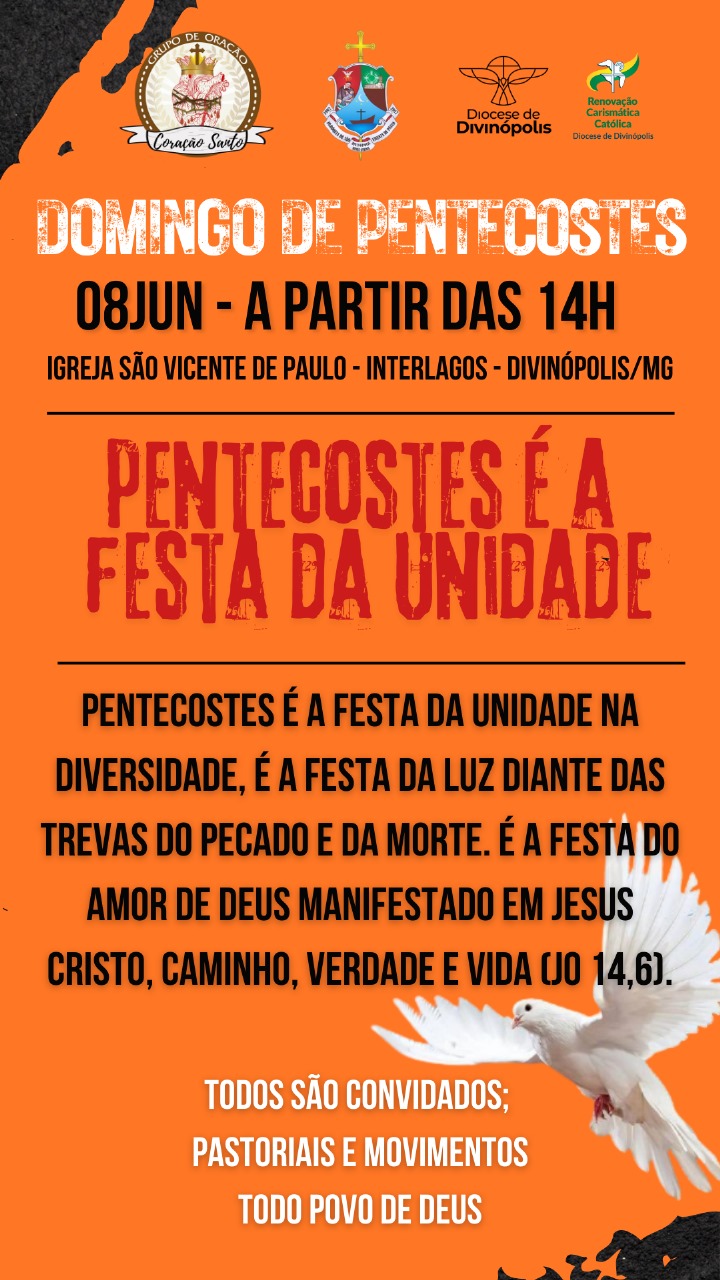 Com o tema: Enchei-vos do Espírito Santo, a Paróquia de São Vicente de Paulo, no bairro Interlagos, promove no próximo dia 08 de Junho, domingo de Pentecostes um encontro para oração e louvor. A programação começa às 14h, com o terço mariano e do Espírito Santo e a visita da imagem peregrina N.S da La Salette (Programação completa em anexo).