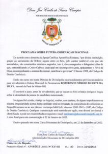Proclama sobre a ordenação diaconal do Robersson Sérgio Duarte da Silva
