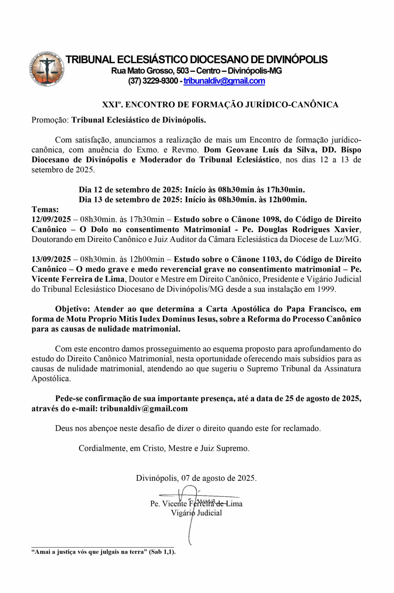Tribunal Eclesiástico convida para o XXI Encontro de Formação Jurídico-Canônica